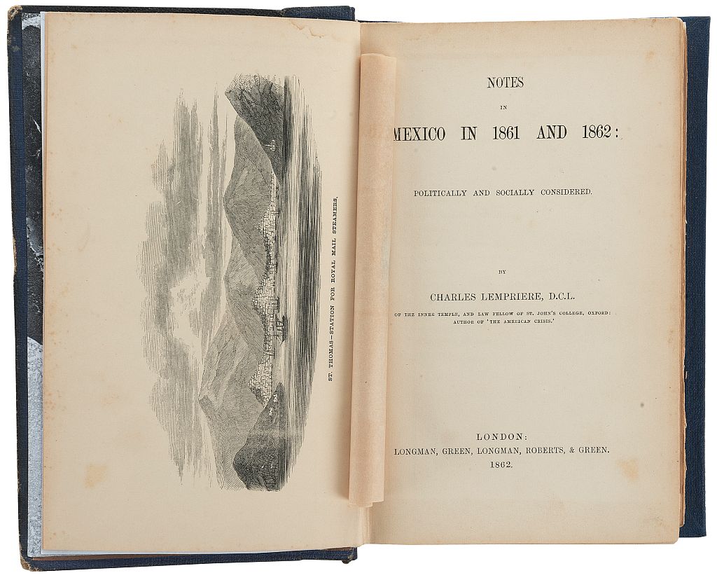 Subasta 899, Lote # 196 HB - Lempriere, Charles. Notes in Mexico in 1861 and 1862. London: Longman, Green, Longman, Roberts, & Green, 1862. 8o. marquilla, 480 + 32 p. Ocho láminas y mapa plegado y a color de México. Sellos de antigua biblioteca. Lomo y pasta posterior restaurados. Conserva pasta anterior original, grabada. Encuadernado en pasta dura, lomo en piel. Narración de un viaje en México durante los años de 1861 y 1862. El autor es testigo del desembarco de fuerzas expedicionarias francesas en Veracruz y de los inicios de la intervención francesa en México. Estimado $7,000-9,000