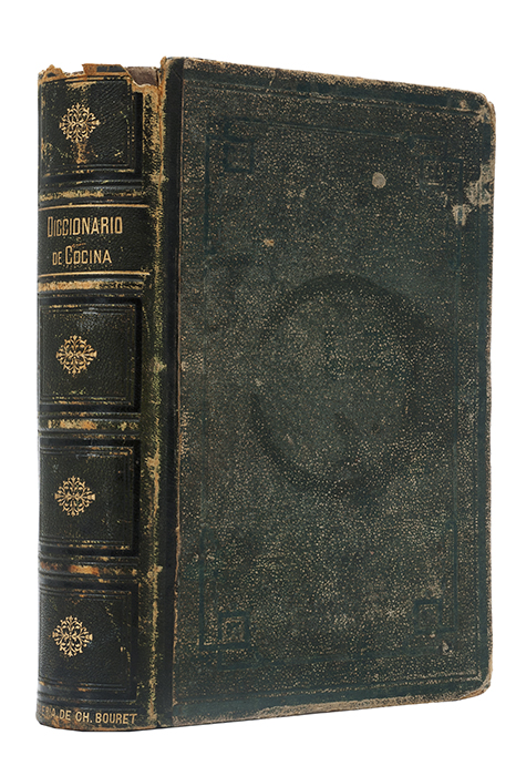 CO - Nuevo Cocinero Americano. En Forma de Diccionario. París / México: Librería de Bouret é Hijo, 1878. 4o. marquilla, frontispicio + 2 h. + 966 p. + VI láminas. Que contiene todos los procedimientos empleados en la alta, mediana y pequeña cocina, la lista normal de los platillos que deben componer las distintas comidas, que con variedad de nombre se hacen en el día… Pastas gastadas, lomo sin cofia. Encuadernado en pasta dura, lomo en piel. Estimado $7,000-9,000