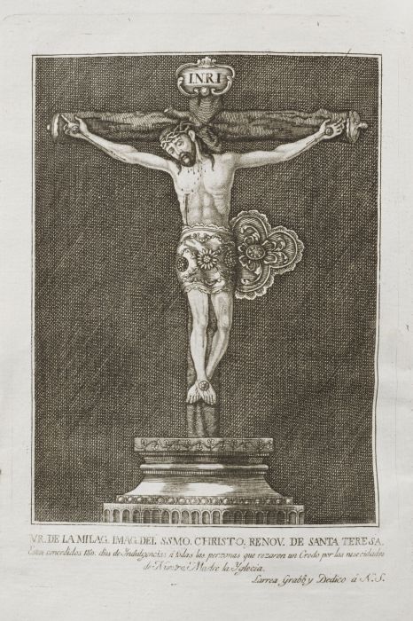 R - Velasco, Alfonso Alberto de. Exaltación de la Divina Misericordia. México: En la Oficina de Don Alexandro Valdés, 1820. 8o. marquilla, 7 h. + 112 p. En la Milagrosa Renovación de la Soberana Imagen de Cristo Señor Nuestro Crucificado. Que se venera en la Iglesia del Convento de Señor San José de Religiosas Carmelitas Descalzas de la antigua fundación de esta Ciudad de México. Con un grabado de Larrea. Portada con sello del Convento de Carmelitas, de Puebla. Encuadernado en pergamino. Estimado $3,000-4,000