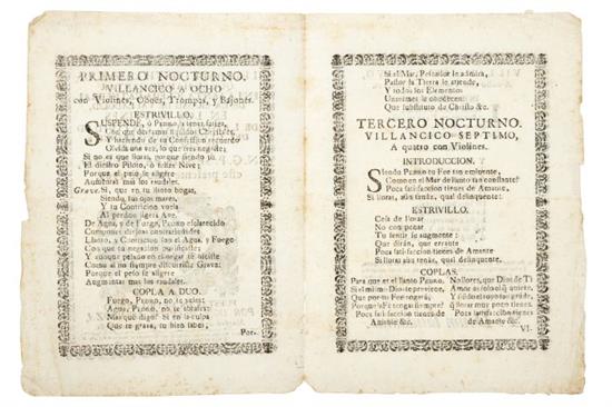 DI - Mendoza, Juan de. Letras de los Villancicos que se han de Cantar en la Santa Iglesia Cathedral de la Ciudad de Valladolid. México: D. Joseph de Jauregui, 1769. 2 hojas. En los Maytines de la solemne festividad del gloriossimo príncipe de los apóstoles N. G. P. Señor San Pedro. Estimado $3,000-4,000
