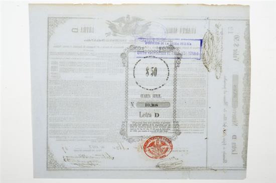 DI - Bono de Deuda Pública. Cuarta Serie. Letra D. Valor $50. Expedido en México el 11 de Marzo de 1863, por orden del Presidente Benito Juárez. Expedido durante la segunda Intervención Francesa. Estimado $4,000-5,000