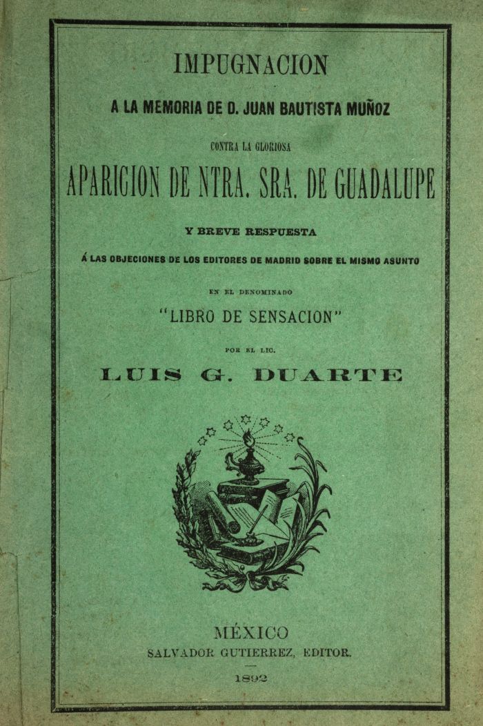 R - García Icazbalceta, Joaquín / Chávez, Gabino / Duarte, Luis G. Carta del Sr. Lic. Joaquín García Icazbalceta a propósito de la aparición de la Virgen de Guadalupe / Celeste y Terrestre o Las dos Coronas Guadalupanas / Impugnación a la memoria de D. Juan Bautista Muñoz contra la Gloriosa Aparición de Ntra. Sra. De Guadalupe, y breve respuesta a las objeciones de los editores de Madrid sobre el mismo asunto en el denominado "Libro De Sensación". a) García Icazbalceta, Joaquín. Carta del Sr. Lic. Joaquín García Icazbalceta a propósito de la aparición de la Virgen de Guadalupe. Pachuca: Tipografía Moderna de Luis B. García, 1900 8o. marquilla, 40 p. Obsequio de la "Corporación Patriótica Privada". Conserva pasta anterior original. Encuadernado en rústica. Se trata de la célebre carta que el historiador Joaquín García Icazbalceta dirigió al Arzobispo Pelagio Antonio de Labastida y Dávalos, en relación a la aparición de la Vírgen de Guadalupe. Hoy en día se conoce a dicho escrito como "La Carta Antiaparicionista". b) Chávez, Gabino. Celeste y Terrestre o Las dos Coronas Guadalupanas. México: Guillermo Herrero y Comp., 1895. 8o. marquilla, 34 p. Reflexiones acerca de la desaparición de la corona en la imagen de Nuestra Señora de Guadalupe. Con pequeños faltantes en el lomo. Encuadernado en rústica. c) Duarte, Luis G. Impugnación a la memoria de D. Juan Bautista Muñoz contra la Gloriosa Aparición de Ntra. Sra. De Guadalupe, y breve respuesta a las objeciones de los editores de Madrid sobre el mismo asunto en el denominado "Libro De Sensación". México: Salvador Gutiérrez, Editor, 1892. 8o. marquilla, 62 p. Pastas originales con pequeñas roturas en los margenes. Encuadernado en rústica. Total de piezas: 3. Estimado $6,000-8,000