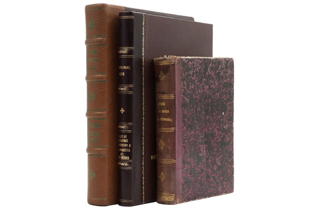 HM - Rea, Fr. Alonso de la / Maas, Otto / Kino, Eusebio Francisco - Fernández del Castillo, Francisco - Bose, Emilio. Crónica de la Orden de N. Seráfico P. S. Francisco / Viajes de Misioneros Franciscanos a la Conquista del Nuevo México / Las Misiones de Sonora y Arizona. a) Rea, Fr. Alonso de la. Crónica de la Orden de N. Seráfico P. S. Francisco, Provincia de San Pedro y San Pablo de Mechoacan en la Nueva España. México: Imprenta de J. R. Barbedillo y Cía., 1882. 8o. marquilla, XV + 488 p. Segunda edición (la primera publicada en 1643). Cantos gastados. Encuadernado en pasta dura, lomo en piel. Alonso de la Rea, primer cronista oficial de la provincia de San Pedro y San Pablo de Michoacán. En la presente obra realiza una descripción geográfica e histórica de la provincia, detallando las costumbres, ritos y lenguas de los habitantes de dicha región. Así mismo realiza una semblanza biográfica de los más reconocidos misioneros y religiosos franciscanos que llegaron a dicha provincia; de sus trabajos, las dificultades que enfrentaron en su labor evangelizadora y de los conventos que ahí fundaron. b) Maas, Otto. Viajes de Misioneros Franciscanos a la Conquista del Nuevo México. Sevilla: Imprenta de San Antonio, 1915. 4o. marquilla, 208 p. + 1 h. (índice). Documentos del archivo general de indias (Sevilla). Con una lámina. Con manchas de óxido y última hoja rasgada. Encuadernado en pasta dura, lomo en piel. Entre los documentos incluidos en este volumen se encuentran: "Fundación de las misiones de Sta. María de los Dolores, San Juan Bautista, San Francisco Solano y San Bernardo", "Diario del viaje que hizo el P. Fr. Silvestre Vélez de Escalante a Moqui", "Estado de las Misiones de la orden de San Francisco, año de 1786", entre otras. c) Kino, Eusebio Francisco - Fernández del Castillo, Francisco - Bose, Emilio. Las Misiones de Sonora y Arizona. México, Editorial Cultura, 1913 - 1922. 4o. marquilla, LXXIX + 413 p. + 1 h. (índice). Publicaciones del archivo general de la Nación VIII. Comprendiendo: La crónica titulada "Favores Celestiales" y la "Relación Diaria de la Entrada al Norueste" por el padre Eusebio Francisco Kino (Kühn). Versión paleográfica e índice por Francisco Fernández del Castillo, con noticias bibliográficas del Padre Kino y sus exploraciones y fundaciones por el Dr. Emilio Bose. Con una lámina. Sin refinar. Portada y lámina con faltantes en margen externo, sin afectar texto ni imagen. Encuadernado en pasta dura, lomo en piel. Total de piezas: 3. Estimado $8,000-10,000