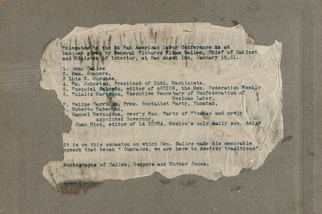 Con firmas de Plutarco Elías Calles, Samuel Gompers y Mother Jones.