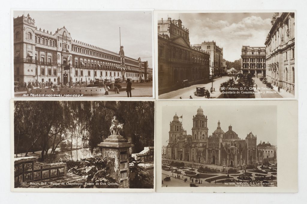 Brehme, Hugo. Vistas de México. Fotopostales, 8.7 x 13.5 cm. Ciudad de México: Palacio de Bellas Artes; Palacio Nacional; El Correo; Casa de los Azulejos; Castillo de Chapultepec; Estatua de Carlos IV; Catedral Metropolitana; Calle de Tacuba; Avenida Juárez; Tipos Mexicanos. Vistas de Cholula, Chalchicomula, Cuernavaca y varias panorámicas. 33 reproducciones fotográficas y 9 impresiones. México, primera mitad del S. XX. Piezas: 42. Estimado $10,000-12,000