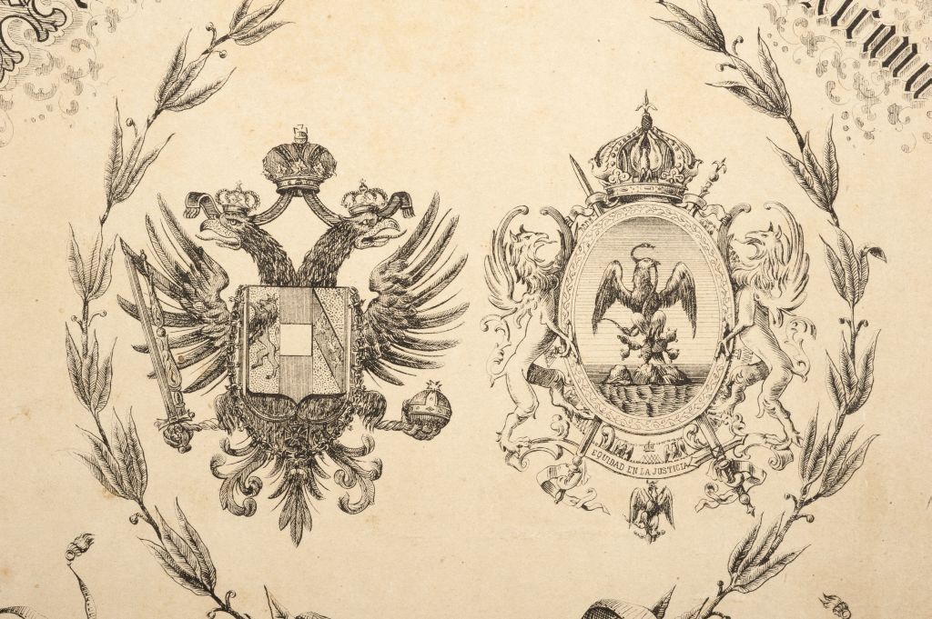 MU - Sawerthal, D. J. R. Álbum de la Música Austriaca - Mexicana, para Piano. México: H. Nagel / J. Rivera [1864]. Folio, 2 h. Colección de piezas selectas. No. 4: El Ruiseñor (polka). Con sello de antiguo propietario. Hojas con manchas de humedad. Hoja musical de la época del Segundo Imperio Mexicano, siendo Maximiliano de Habsburgo Emperador. Se muestra en la portada el Escudo de Armas del Imperio Austríaco, junto al Escudo de Armas del Segundo Imperio Mexicano. Estimado $6,000-8,000