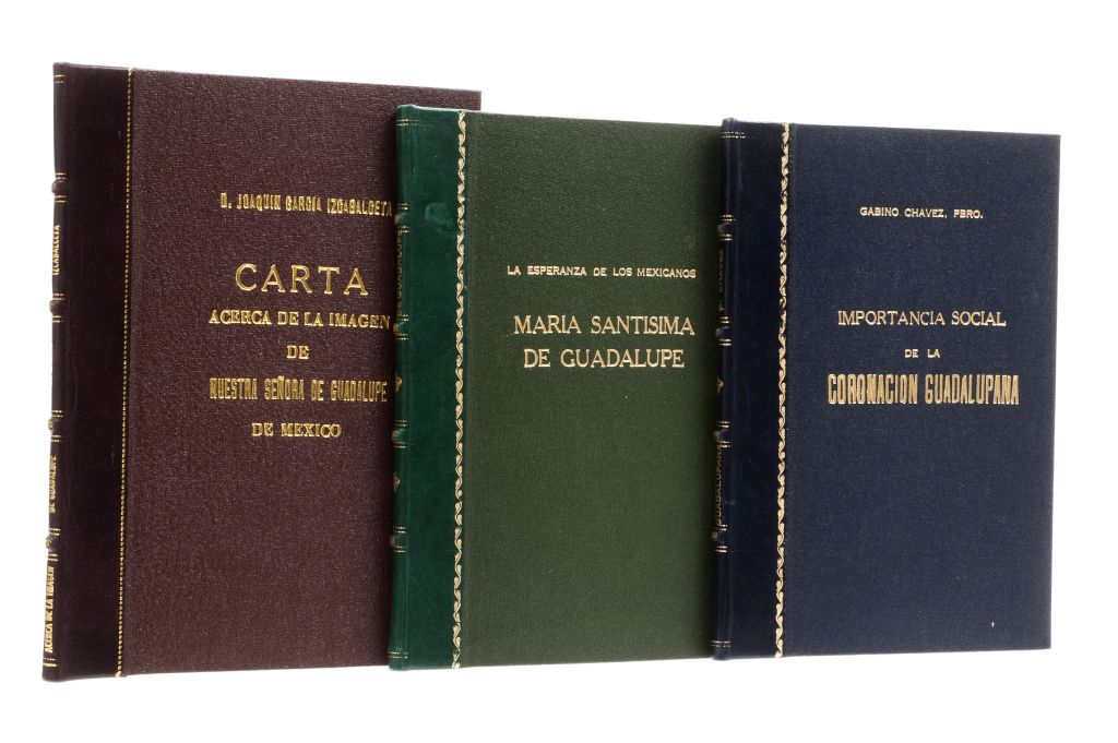 R - Sotomayor, José Francisco / Chávez, Gabino / García Icazbalceta, Joaquín La Esperanza de los Mexicanos, María Santísima de Guadalupe / Importancia Social de la Coronación Guadalupana / Carta acerca de la Imagen de Nuestra Señora de Guadalupe de México. a) Sotomayor, José Francisco. La Esperanza de los Mexicanos, María Santísima de Guadalupe. 8o. marquilla, 69 p. Texto con mancha de humedad. Encuadernado en pasta dura, lomo en piel. Obra que busca incentivar la devoción a la Virgen de Guadalupe como una forma de remediar todos los males que aquejan a la patria, mezclando de esta manera el Nacionalismo Mexicano con el culto Guadalupano. b) Chávez, Gabino. Importancia Social de la Coronación Guadalupana. Querétaro: Imp. de Luciano Frías y Soto, 1895. 8o. marquilla, 34 p. Discurso Leído en la Velada Literaria celebrada el 12 de Noviembre, en Irapuato, en honor a la coronación de la Virgen de Guadalupe. Texto con mancha de humedad, portada y última hoja con faltantes restaurados y rasgaduras. Encuadernado en pasta dura. c) García Icazbalceta, Joaquín Carta acerca de la Imagen de Nuestra Señora de Guadalupe de México. México: 1896. 8o. marquilla, 40 p. Texto con pequeña mancha de humedad en el margen derecho. Encuadernado en pasta dura, lomo en piel. Se trata de la célebre carta que el historiador Joaquín García Icazbalceta dirigió al Arzobispo Pelagio Antonio de Labastida y Dávalos, en relación a la aparición de la Vírgen de Guadalupe. Hoy en día se conoce a dicho escrito como "La Carta Antiaparicionista". Estimado $6,000-8,000