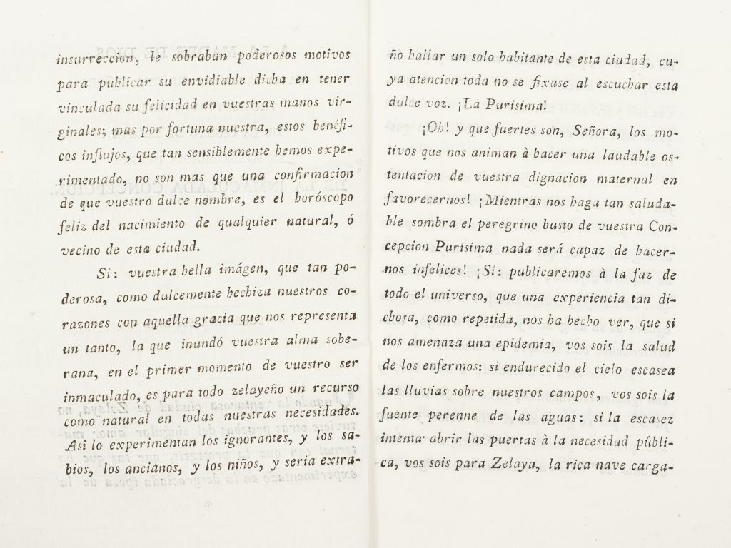 HU - Bringas, Fray Diego Miguel. Sermón de Gracias por la Sorpresa del Castillo de San Fernando de Figueras Hecha por Antonio de Robira, al Frente de 900 Españoles el Día Diez de Abril de 1811. México: En la Imprenta de Arizpe, 1811. 8o. marquilla, 3 h. + 32 p. Predicado en la Iglesia del Colegio de la Purísima Concepción de religiosos franciscanos de la ciudad de Zelaya, el día 4 de agosto del mismo año… Quien lo dedica a nombre y expensas de todo el vecindario de la misma ciudad, a su singular defensora, patrona y Madre María Santísima, proclamada generala por dicha ciudad el 17 de Septiembre, en su bellísima imagen de su Purísima Concepción. Portada rasgada. Cosido, con pasta en rústica. Bringas de Manzaneda y Encinas, en su introducción al Sermón y dentro del mismo hace referencia sobre algunos acontecimientos durante la primera etapa de la guerra de Independencia en las que recibieron la protección de la Inmaculada Concepción: "desgraciada época de a insurrección... si nos amenazan las huestes enemigas, vos sois para ellas tan terrible, como los esquadrones bien ordenados..." ¡Si: los días diez y seis de marzo, seis de junio, y veinte y uno de septiembre (toma de Celaya por los insurgentes) son otras tantas pruebas de vuestra protección, sois el principal medio de nuestra defensa, permitís que en los ataques de Zelaya, traiga siempre el enemigo un agujero de desgracia y nuestro triunfo...". "...¡Desate, pues, contra Zelaya todas sus furias el abismo: dispongan ataques los insurgentes insensatos, que entre tantos nosotros descansaremos tranquilos, sostenidos por la firme esperanza de que la táctica, y el poder de nuestra divina generala, serán siempre un anuncio indefectible de nuestra victoria!… que así como todas las ventajas que han conseguido las armas españolas, en la antigua y Nueva España, son un puro efecto de vuestra protección, también la humillación completa de nuestros enemigos…", véase en primeras 3 hojas. Abunda el sermón con oprobios al movimiento insurgente y a sus líderes: "...haciendo resonar la ronca trompeta de la rebelión más infame, no escucha en mucha parte de su vasta extension, más que estas sangrientas y amenazadores voces! ¡Mueran los españoles! ¡Mueran nuestros abuelos, nuestros padres y nuestros hermanos!...", véase en página 24. "... el mal ha sido infinitamente mayor a lo que se imaginó al principio, y las tropas de S.M. han tenido que combatir con exército de quarenta, setenta, ochenta y también de más de cien mil hombres...", véase en página 25. Estimado $10,000-14,000