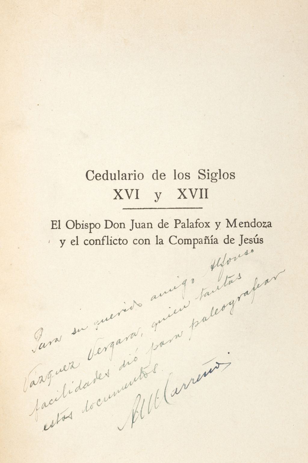 T - Carreño, Alberto María. Un Desconocido Cedulario del S. XVI / Cedulario de los S. XVI y XVII / Joyas Literarias del Siglo XVII. a) Un Desconocido Cedulario del Siglo XVI. México: Ediciones Victoria, 1944. 4o. marquilla, 488 p. Perteneciente a la Catedral Metropolitana de México. Encuadernado en pasta dura. b) Cedulario de los Siglos XVI y XVII. México: Ediciones Victoria, 1947. 4o. marquilla, 750 p. El Obispo Don Juan de Palafox y Mendoza y el Conflicto con la Compañía de Jesús. Encuadernado en pasta dura. c) Joyas Literarias del Siglo XVII encontradas en México. Imprenta Franco - Mexicana, a cargo de E. Aguirre, 1915. 4o. marquilla, 264 p. Fr. Miguel de Guevara y el célebre soneto castellano "No me mueve mi Dios, para quererte". Retrato e ilustraciones del autor. Edición de 500 ejemplares, ejemplar número 70. Sin refinar. Encuadernado en pasta dura. Total de piezas: 3. Estimado $5,000-6,000