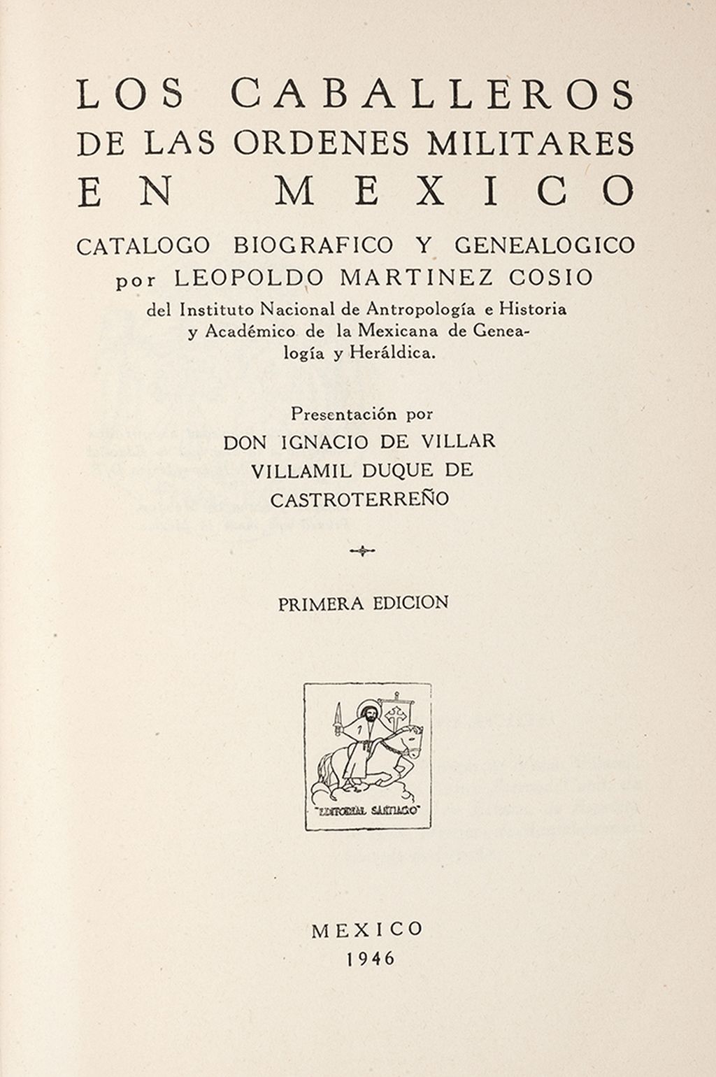 GN - Martínez Cosio, Leopoldo / Cabrera Ipiña de Corsi, Matilde / Dávila Garibi, José Ignacio. Los Caballeros de las Órdenes Militares en México / Cuatro Grandes Dinastías Mexicanas en los descendientes de los hermanos Fernández de Lima y Barragán / Los Nietos de Don Juan. a) Martínez Cosio, Leopoldo. Los Caballeros de las Órdenes Militares en México. México: Editorial Santiago, 1946. 4o. marquilla, XVIII + 353 p. Catálogo biográfico y genealogico. Presentación por Ignacio de Villar. Primera edición. Ilustrado. Sin refinar. Encuadernado en rústica. b) Cabrera Ipiña de Corsi, Matilde. Cuatro Grandes Dinastías Mexicanas en los descendientes de los hermanos Fernández de Lima y Barragán. San Luis Potosí: Editorial Universitaria Potosina, 1956. 8o. marquilla, 181 p. Con retrato de la autora. Encuadernado en rústica. c) Dávila Garibi, José Ignacio. Los Nietos de Don Juan. México: Editorial Cultura, 1949. 4o. marquilla, 102 p. Dedicado por el autor. Datos poco o nada conocidos que pueden ser de utilidad para la genealogía del ilustre Conquistador D. Juan de Villaseñor, fundador de Valladolid de Michoacán. Pastas y lomo gastados, sin refinar. Encuadernado en rústica. Total de piezas: 3. Estimado $6,000-8,000