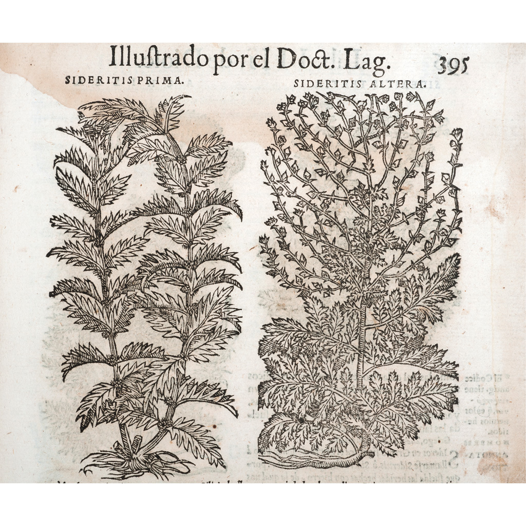 ME - Dioscórides Anazarbeo, Pedacio. Acerca de la Materia Medicinal y de los Venenos Mortíferos. Salamanca: Mathias Gast, 1566. 4o. marquilla, 5 h. + 616 p. + 14 h. Traduzido de lengua Griega, en la vulgar Castellana, & illustrados con claras y substanciales annotationes, y con las figuras de innumeras plantas exquisitas y raras, por el Doctor Andrés de Laguna. Portada con aviso de expurgación por el Santo Oficio de la Inquisición en la portada. Texto con puntos y surcos de polilla, afecta poco texto; manchas de humedad y óxido; algunos renglones rayados; portada, páginas 65-66, 141-142, 141-150, 171-172, 189-190, 207-208, 221-22 y algunos puntos y surcos de polilla restaurados; últimas 9 hojas: una sin un tercio de hoja y 8 restauradas (4 sin afectar texto, 3 afecta texto y una a la mitad). Encuadernado en pergamino. Tercera edición (la primera es de Venecia 1553 y la segunda de Estrasburgo 1554), pero la primera en contener ilustraciones. Obra dividida en 5 partes: Libro I, estudia los productos aromáticos y medicamentos obtenidos de los árboles; Libro II, se describen los medicamentos de origen animal, las legumbres y las hortalizas; Libro III, se relaciona las raíces, hierbas, semillas y zumos; Libro IV, estudia otras hierbas y raíces; Libro V, trata de los vinos y minerales; Libro VI, es un compendio de toxicología titulado "Acerca de los venenos mortíferos y de las fieras que arroja de su ponzoña". Estimado $180,000-220,000