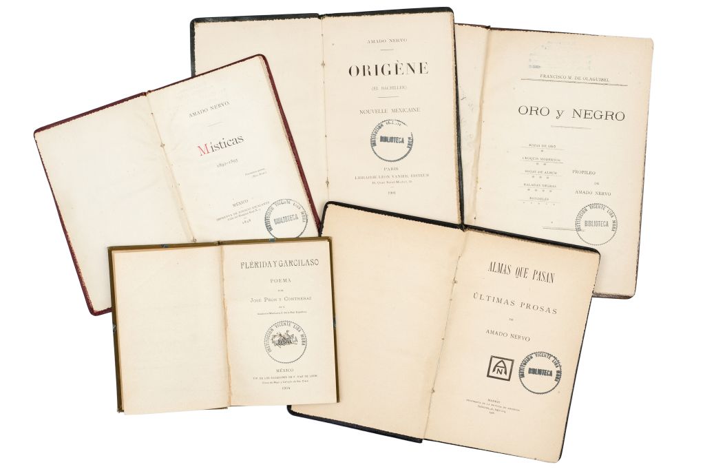 L - Nervo, Amado / Peón y Contreras, José / Oliguibel, Francisco M. de Místicas / Origéne / Almas que Pasan / Flérida y Garcilaso / Oro Negro. a) Nervo, Amado. Místicas. México: Imprenta de Ignacio Escalante, 1898. 8o. marquilla, 73 p. 1892-1895. Dedicado y firmado por el autor: "Para Luis G. Urbina, muy sincera y cariñosamente...". Ex-libris grabado por Antonio Cortés. Con sellos de antigua biblioteca. Sin refinar. Encuadernado en pasta blanda, en piel. b) Nervo, Amado. Origéne. Paris: Librairie León Vanier, 1901. 8o. marquilla, 79 p. El Bachiller. Nouvelle Mexicaine. Dedicado, firmado y fechado por el autor: "Para Luis G. Urbina , fraternalmente...". Ex-libris grabado por Antonio Cortés. Con sellos de antigua biblioteca. Sin refinar. Encuadernado en pasta blanda, en piel. c) Nervo, Amado. Almas que Pasan. Madrid: Tipografía de la Revista de Archivos, 1906. 8o. marquilla, 144 p. Últimas Prosas. Dedicado y firmado por el autor: "Para Luis, este nuevo libro de España, que es un viejo libro de México, fraternalmente...". Ex-libris grabado por Antonio Cortés. Con sellos de antigua biblioteca. Sin refinar. Primera hoja de texto con pequeño faltante en margen superior, sin afectar texto. Encuadernado en pasta blanda, en piel. d) Peón y Contreras, José. Flérida y Garcilaso. México: Tip. de los Sucesores de F. Díaz de León, 1904. 16o. marquilla, 123 p. Poema. Dedicado, firmado y fechado por el autor: "Al inspirado y eximio poeta Luis G. Urbina, su viejo amigo y constante admirador, en testimonio de cariño y gratitud...". Ex-libris grabado por Antonio Cortés. Con sellos de antigua biblioteca. Lomo gastado. Encuadernado en pasta dura. e) Oliguibel, Francisco M. de Oro y Negro. Toluca: Oficina Tipografica del Gobierno, 1897. 4o., 69 p. Propileo de Amado Nervo. Dedicado, firmado y fechado por el autor: "Al genial poeta Luis G. Urbina. Su amigo sincero...". Ex-libris grabado por Antonio Cortés. Con sellos de antigua biblioteca. Lomo gastado. Encuadernado en pasta blanda, en piel. Total de piezas: 5. Luis Gonzaga Urbina, fue un escritor mexicano, nacido en la Ciudad de México, debido a la calidad de su producción poética, por la riqueza y variedad de su obra periodística, es considerado como uno de los escritores más representativos de las Letras Mexicanas del Siglo XX. En su juventud colaboró con diversos diarios por ejemplo: El Siglo XIX así como en revistas de la época, redactando artículos de crítica, tanto de teatro como de música, también cultivó el género de la crónica, con aportes de un gran nivel literario. Dedico muchos años a la enseñanza, campo en el cual alcanzó el puesto de profesor de Literatura Española, de donde pasó a asumir la dirección de la Biblioteca Nacional de México. Entretanto colaboró con algunos rotativos y revistas tan relevantes como El Mundo Ilustrado, El Imparcial y Revista Azul, donde se hizo célebre por sus crónicas de la realidad cotidiana de México y por sus severas críticas teatrales. En 1915 debido a los acontecimientos revolucionarios que sacudieron a México, Urbina opto por el exilio el cual lo condujo primero a Cuba (en cuya capital continuó practicando el periodismo) y, posteriormente, a España (1916), donde vivió durante un año en Madrid como corresponsal de El Heraldo de La Habana. En 1917 pasó unos meses en Argentina para dictar un ciclo de conferencias sobre literatura mexicana en la Universidad de Buenos Aires; de vuelta a España, fue nombrado desde México Primer Secretario de la Embajada Mexicana en Madrid, cargo que desempeñó durante dos años (1918-1920). Vuelto a Madrid, Luis Gonzaga Urbina se encargó de poner en orden el legado que había dejado tras su muerte el Historiador Mexicano Francisco del Paso y Troncoso. En estas y otras actividades similares estuvo ocupado durante el resto de su vida, concluida en la capital de España en 1934. Tras su fallecimiento, el gobierno mexicano reclamó sus restos mortales y los trasladó a la Ciudad de México, donde fueron depositados en la Rotonda de los Hombres Ilustres. La obra de Urbina incluye las crónicas "Bajo el sol y frente al mar, impresiones de Cuba" y "Luces de España", los ensayos sobre literatura "El teatro nacional" y "La literatura mexicana durante la guerra de la Independencia", y los poemarios "Lámparas en agonía" y "Glosario de la vida vulgar". Entre los poemas de su autoría destaca "Metamorfosis". Estimado $20,000-25,000