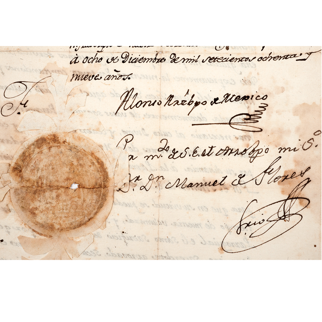 "Nos el Dor. Dn. Alonso Núñez de Haro y Peralta por la Gracia de Dios y de la Santa Sede Apostólica Arzobispo de México del Consjo de S. M. &. Por quanto en memorial que ante Nos se presento por parte de Don Pedro García de Azevedo Dueño de la Hacienda nombrada de Bravo en el Curato del Pueblito, perteneciente a la Vicaría Auxiliar de Hueymilpan, se no expuso haverse confundido o traspapelado la Licencia de celebrar el santo sacrificio de la Misa en la Capillla de dicha Hacienda; y que para continuar en el goze y uso de esta gracia nos pedia y suplicaba fuesemos servido conceder expresamente la nuestra... Por el thenor de el presente la damos y concedemos para que en u virtud se pueda celebrar... el Santo sacrificio de la Misa por qualquier Sacerdote aprovado... Dada en esta Ciudad de México firmada d Nos sellada con el sello de Ntas. armas.... a ocho de Diciembre de 1789 años.".