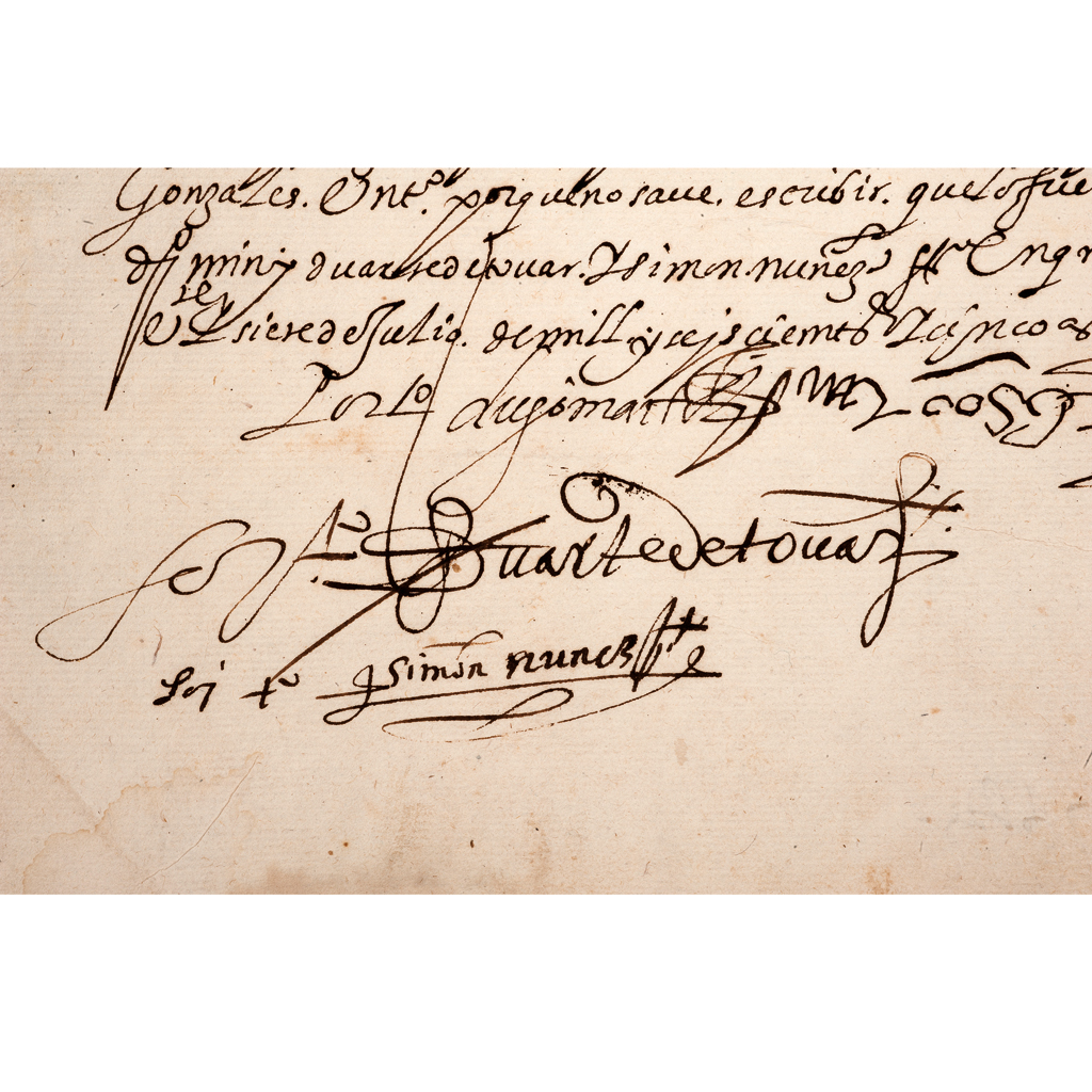 DM - Velasco, Luis de / El Conde de Alburquerque. Merced / Autos. a) Velasco, Luis de. Merced. Al reverso: "Título de un sitio de Estancia de ganado Menor, y dos Cavallerias de tierra en Gumilpa de Beatriz de Orduña.". En México a 28 de Agosto de 1591. Deteriorado, con faltantes, pegado sobre otra hoja como refuerzo. b) El Conde de Alburquerque (Francisco Fernández de la Cueva). Autos. Para que el Alcalde Maior de la ciudad de santiago de querétaro su tente. y demas Juristas desta nueva españa: Guarden y cumplan el auto proveido por esta Rl. auda. aqui inserto. Y en su conformidad y de la escriptura de venta y possesion asi mismo inserto amparen al capitan Juan de Berttis santiestevan en el sitio de estancia de ganado menor y dos cavs. de tierra... Dada en la Ciudad de México a 27 de Septiembre de 1659. Con un total de 31 hojas. Mancha de tinta, afecta margen interno y texto del último tercio. Estimado $10,000-12,000