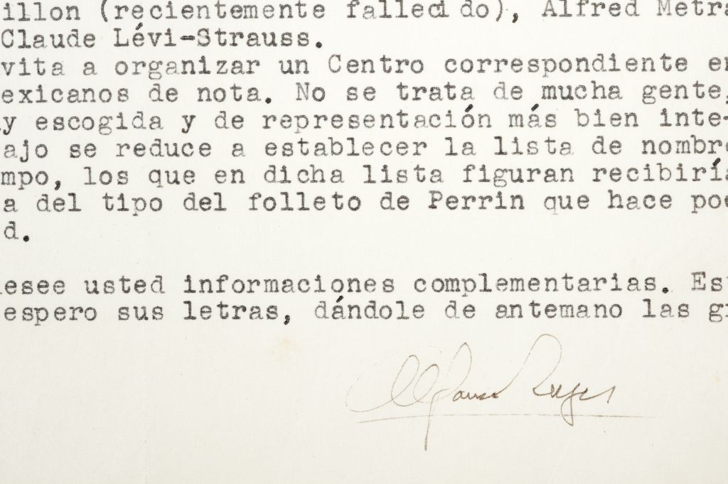 DM - Reyes, Alfonso. Carta Dirigida al Sr. Octavio G. Barreda. "... Se me ofrecen con usted dos asuntos, que sólo significan por su parte el autorizarme a poner su respetable nombre en una lista muy selecta y cuidadosa de firmas...1°. En Londres, en Nueva York y en varias capitales de nuestra América Latina personalidades representativas y de primera línea se reúnen, independientemente y por separado en cada país, para en determinado momento, firmar y enviar a su respectivo Gobierno el breve mensaje siguiente... 2°. Existe en Nueva York un Latin American Center, organizado en Escuela Libre de Altos Estudios y Centro de Información para las Relaciones Culturales con nuestra América, que viene a ser foco intelectual...Tal vez desee usted informaciones complementarias. Estoy a sus órdenes y espero sus letras, dándole de antemano las gracias...". México, D.F.: 11 de Mayo de 1943. Firma. Hoja mecanografiada. Estimado $6,000-8,000