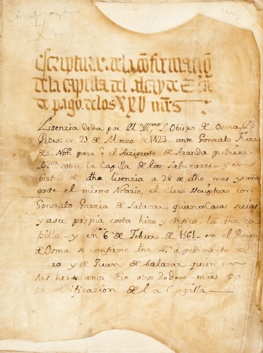 De la portada: "Lisenzia dada por el Yllmo. Obspo de Osma, D. Pedro: En 21 de Mazo de 1423 ante Gonzalo Ferrades Noto. para que el Arziprexte de Aranda pudiera Ssar. sobre la Capilla de los Salazares y en birtud de dha. lisenzia a 28 d dho. mes y año ante el mismo Notario, el clero Sscripturo con Gonzalo Garcia de Salazar, quien en casas suias y asu propia costa hizo y edifico la dha. capilla y en 6 de Febrero de 1561 en el Buxgo de Osma se confirmo dha. Ssa. a pedimento del Clero y de Juan de Salazar quien con sus hermanos dio otros 20d000 mars. para edificacion de la Capilla.".