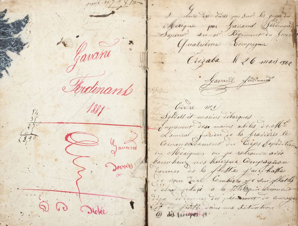 DM - Gavand, Ferdinand. Cuaderno de un Soldado Francés durante la Intervención Francesa y el Segundo Imperio. México, 1862-1867. 8o. marquilla, 3-9, 12-79 y 80 folios. Cofia y pie deteriorado, pastas y lomo gastados. Folio 9 desprendida y rasgada; folio 57 sin esquina superior, afecta texto; folio 67 con notas manuscritas y dibujo con color; folio 80 con notas manuscritas. Texto en francés con notas en español. Lomo y pastas por desprenderse. Cuaderno de un soldado zapador francés del "1er Regiment du Linie, Quatriéme Compagnie", en donde transcribe las ordenes, comunicados y decretos de comandantes de la intervención como el Conde de Lorencez, General Forey, General Bazaine, y de algunos Mexicanos como Manuel Doblado, General Jesús González Ortega, entre otros. Además de transcripciones de pasajes y canciones en español, incluyendo una dedicada al Emperador Maximiliano en folio 76 "Salud, Emperador, salud Emperador, la bella tierra que a tu presencia engalanada tienes, orna con flores sus hermosas cienes…Salud Emperador, dichosa sea en nuestro suelo tu feliz venida…". El manuscrito contiene información sobre la llegada de los franceses a Orizaba en Abril y Mayo de 1862, con menciones de los números de enfermos, la Coronación de Maximiliano, la batalla de Camarón entre el ejército Mexicano y la Legión Extranjera Francesa y la batalla y asedio de Puebla… Inusual manuscrito francés, con información sobre la invasión de las tropas francesas en México y su posterior ocupación durante el Segundo Imperio Mexicano. Estimado $25,000-30,000