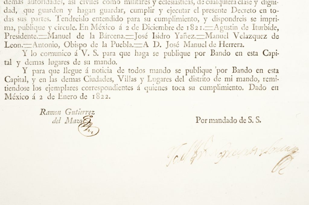 "... La Soberana Junta provisional gubernativa del Imperio, teniendo en consideración lo prevenido en el art. 78 tít. 9 del reglamento de jurados, tuvo a bien determinar se nombrase la Junta protectora de Libertad de Imprenta, y habiendose procedido a la elección, recayó la de Presidente en el Fiscal de esta Audiencia D. José Hipólito Odoardo, y la de Vocales en D. Rafael Mangino , D. José Ignacio Nagera, D. José Nicolás Maniau, Cnónigo Lectoral de esta Santa Iglesia, Dr. y Mtr. D. Manuel Gómez Marín, D. Tomás Alamán, y Dr. D. José María Mora...". Dado en México a 2 de Enero de 1822. Rúbrica de Ramón Gutiérrez del Mazo y firma de José Ignacio Negreyros y Soria.
