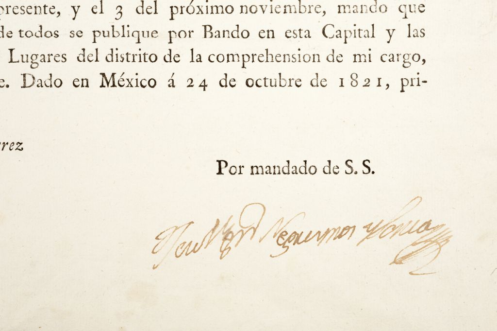 DI - Gutiérrez del Mazo, Ramón. Bando: En reconocimiento de la "Primer Garantía", decreta hacer Rogativas. "... Considerándose la Soberana Junta provisional gubernativa del Imperio Mexicano estrechamente obligada a hacer una demostración positiva de su reconocimiento a la primera garantia de la Religión, que tan piadosamente pronunció el Ejército Imperial y su Primer Gefe, ha venido a decretar y decreta, que se hagan rogativas públicas por tres días, implorando el auxilio y bendiciones del Altísimo para el acierto del gobierno nacional...". Dado en México a 24 de octubre de 1821. Firma de José Ignacio Negreyros y Soria. Estimado $8,000-10,000