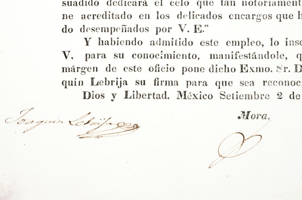 Mora y Villamil, Ignacio de. Circulares del Ministro de Guerra y Marina. a) Circular sobre Nombramiento de Joaquín Lebrija como Secretario de Estado y del Despacho de Hacienda. México, septiembre 2 de 1834. Rúbrica de Ignacio de Mora y firma de Joaquín Lebrija. Pequeños faltantes en margen y esquina inferior izquierda, no afecta texto. b) Circular sobre Nombramiento de José Antonio Romero como Ministro de lo Interior. México, octubre 25 de 1837. Rúbrica de Ignacio de Mora y firma de José Antonio Romero. c) Circular sobre Nombramiento de Luis Gonzaga Cuevas como Secretario del Despacho de Relaciones Exteriores, en Segunda Ocasión. México, enero 10 de 1838. d) Circular sobre Cargo de José María Bocanegra como Secretario de Despacho de Hacienda, quien Tenía el Cargo de los Despachos de Relaciones Exteriores y de Hacienda. México, enero 9 de 1838. Total de piezas: 4. Estimado $ 6,000-8,000