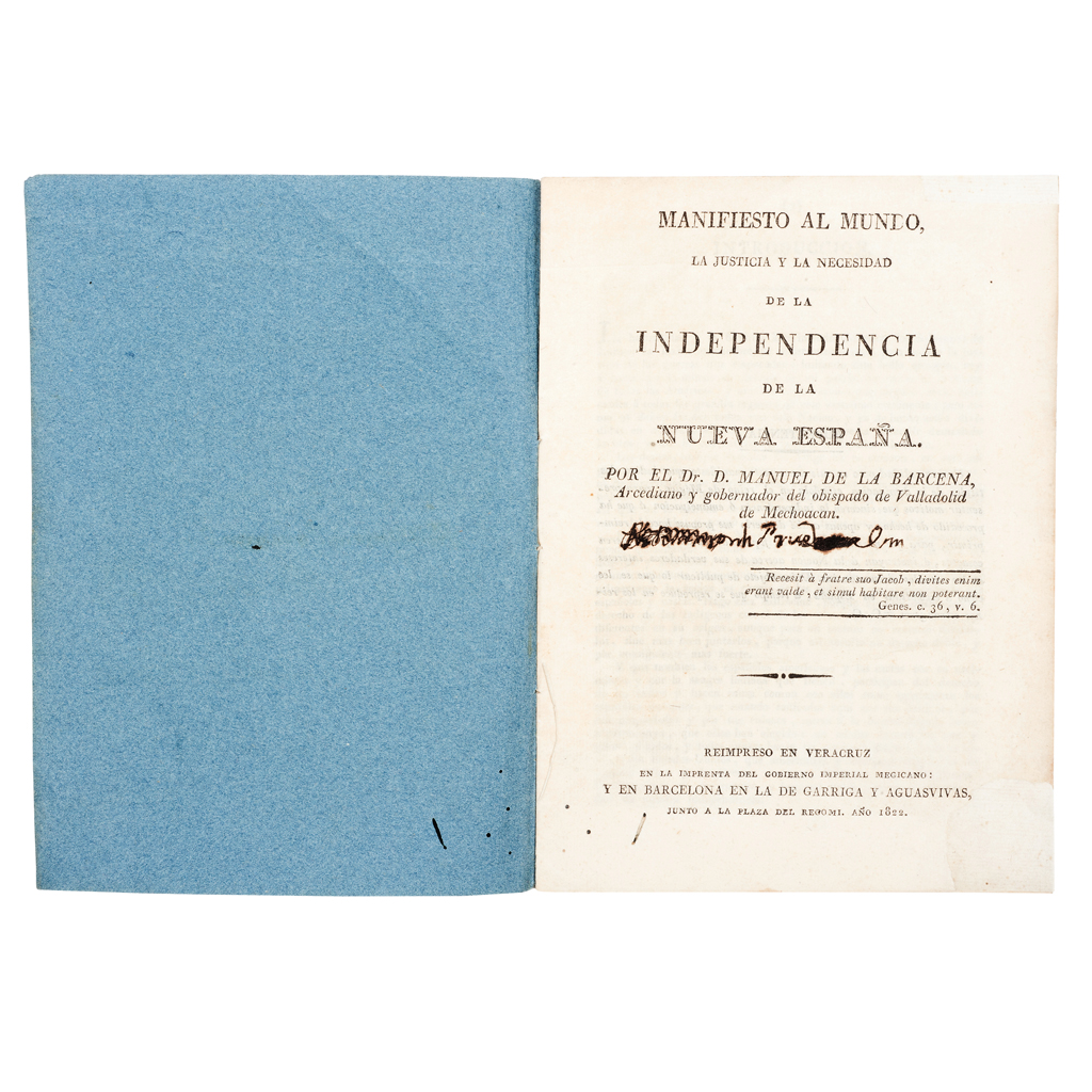 Barcena, Manuel de la. Manifiesto al Mundo, la Justicia y la Necesidad de la Independencia de la Nueva España. Veracruz - Barcelona: Imprenta del Gobierno Imperial Megicano - Imprenta de Garriga y Aguasvivas, 1822. 8o. marquilla, 16 p. Portada restaurada de esquina inferior derecha. Margen inferior izquierdo del ejemplar con pequeños puntos y surco de polilla afectando desde pasta anterior hasta la página 10, de la 11 en adelante solo con puntos de polilla hasta la pasta posterior. Encuadernado en rústica. Editado durante el reinado de Agustín de Iturbide, ante la amenaza de la Corona Española por invadir y reconquistar sus antiguos dominios de la Nueva España. Manuel de la Bárcena justifica y defiende la independencia de México, basándose en principios de justicia y de necesidad, y en las ideas ilustradas de los filósofos franceses. Existe una edición anterior de 1821. Estimado $ 16,000-20,000