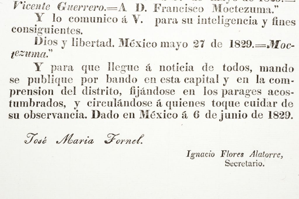 Tornel, José María. Bando acerca de la Concesión de Indultos a Desertores y Presos Políticos Durante el Reinado de Agustín de Iturbide.México, junio 6 de 1829. Durante el reinado de Agustín de Iturbide la deserción en todos los estratos del ejército se había convertido en uno de los principales problemas del Primer Imperio. La creciente devaluación de más del 50% del papel moneda con que se pagaba a los soldados jugó un factor importante; sin embargo, la poca popularidad del imperio pronto resultó en numerosas bajas: uniéndose muchos a la causa Republicana de Santa Anna y desertando muchos más cuando Iturbide disuelve el Congreso. La carencia de apoyo del ejército se volvió un factor decisivo para la renuncia del emperador. Veáse en: Cacho, Angélica María. Entre la utilidad y la coerción. Los desertores. Estud. hist. mod. contemp. Mex no.45 México enero / junio 2013. El presente bando no sólo indulta a los muchos que desertaron del ejército, sino que también incluye a los numerosos que fueron perseguidos por opiniones políticas durante el represivo mandato de Iturbide. Estimado $ 7,000-9,000