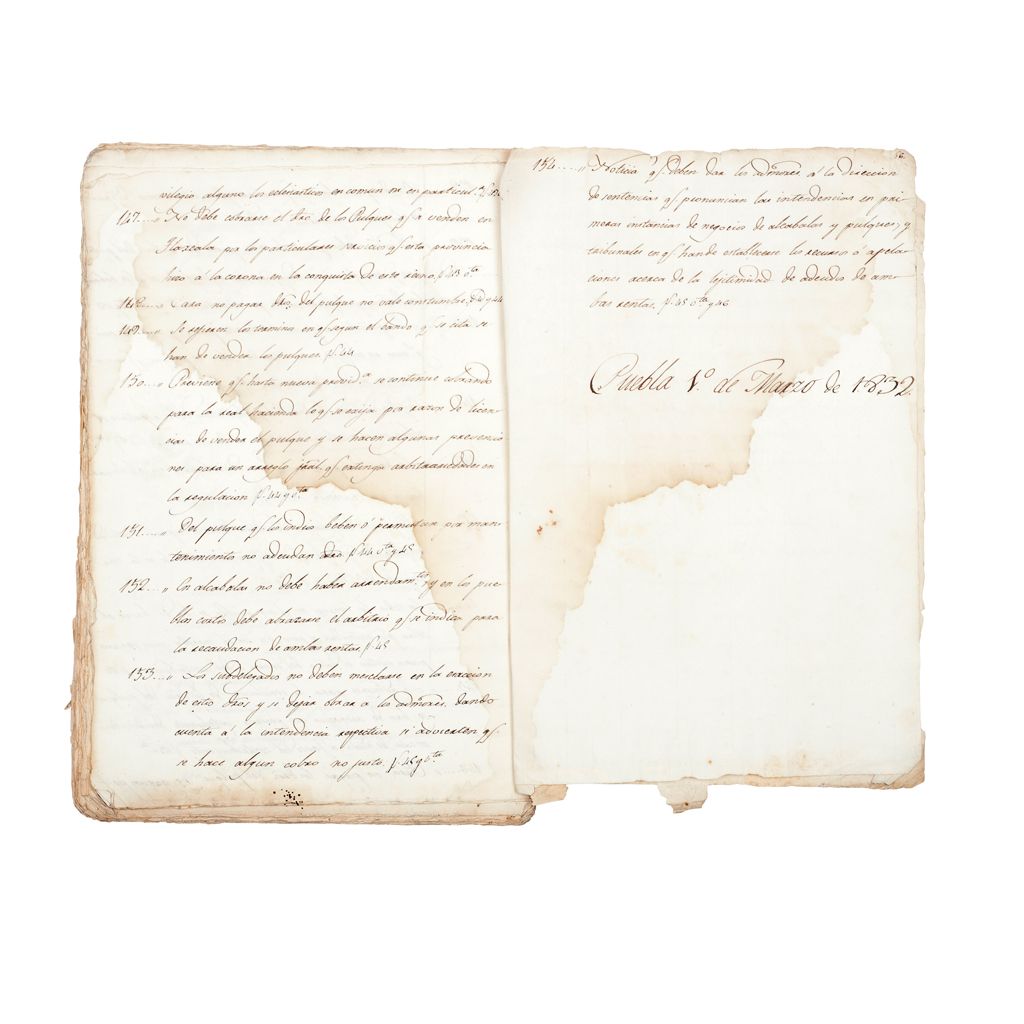 Reglamento de Alcabalas. Yntrucción para que los Administradores de Aduanas del Reino de Nueva España hagan la Legitima Eracción de los Derechos de Alcabalas y Pulques en los Casos que por lo Regular se Ofrecen en los Propios Artículos. "El derecho natural dicta que el que de todos cuida, de todos reciba el premio, y lo necesario para el fin, y el mismo Jesucristo no solo manda que a Dios se de lo que es de Dios y al Cesar lo que es del Cesar sino que para no singularizarse en no satisfacer el tributo se sujetó voluntariamente a él…La cuota del 6% de alcabala es y se entiende con calidad de por ahora pues el rey tiene el arbitrio que es justo para aumentarlo cuando lo pidan las atenciones de la corona…La alcabala en este reino se ha de cobrar precisamente en dinero fisico…". Puebla, marzo 1 de 1832. Documento que consta de tres partes; la primera en donde se hace una introducción de lo que son las alcabalas, así como algo de su historia y su funcionamiento, la segunda parte consta de 154 artículos en los que se detallan los montos y las formas de pago, así como de las particularidades de cada caso en cuanto al cobro de alcabalas poniendo énfasis en el cobro y producción de pulque, la última parte consta de un índice con resumen de cada artículo. Legajo. Algunas hojas con faltantes en márgenes; con manchas de óxido y humedad, afecta poco texto. Estimado $ 6,000-8,000
