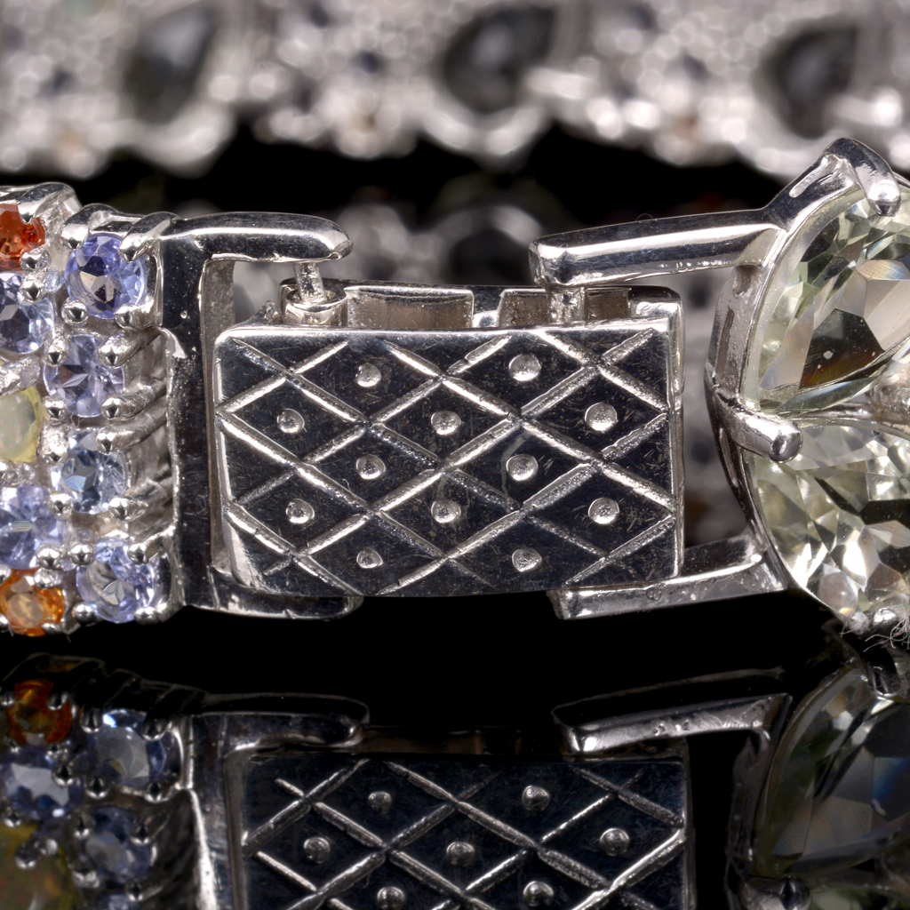 Con 26 prasiolitas corte pera, ~ 22.97 ct., 18 ópalos blancos con juego de colores corte cabujón redondo, ~ 0.75 ct., 78 tanzanitas corte redondo facetado, ~ 5.94 ct. y 26 zafiros naranjas corte redondo facetado, ~ 1.18 ct.