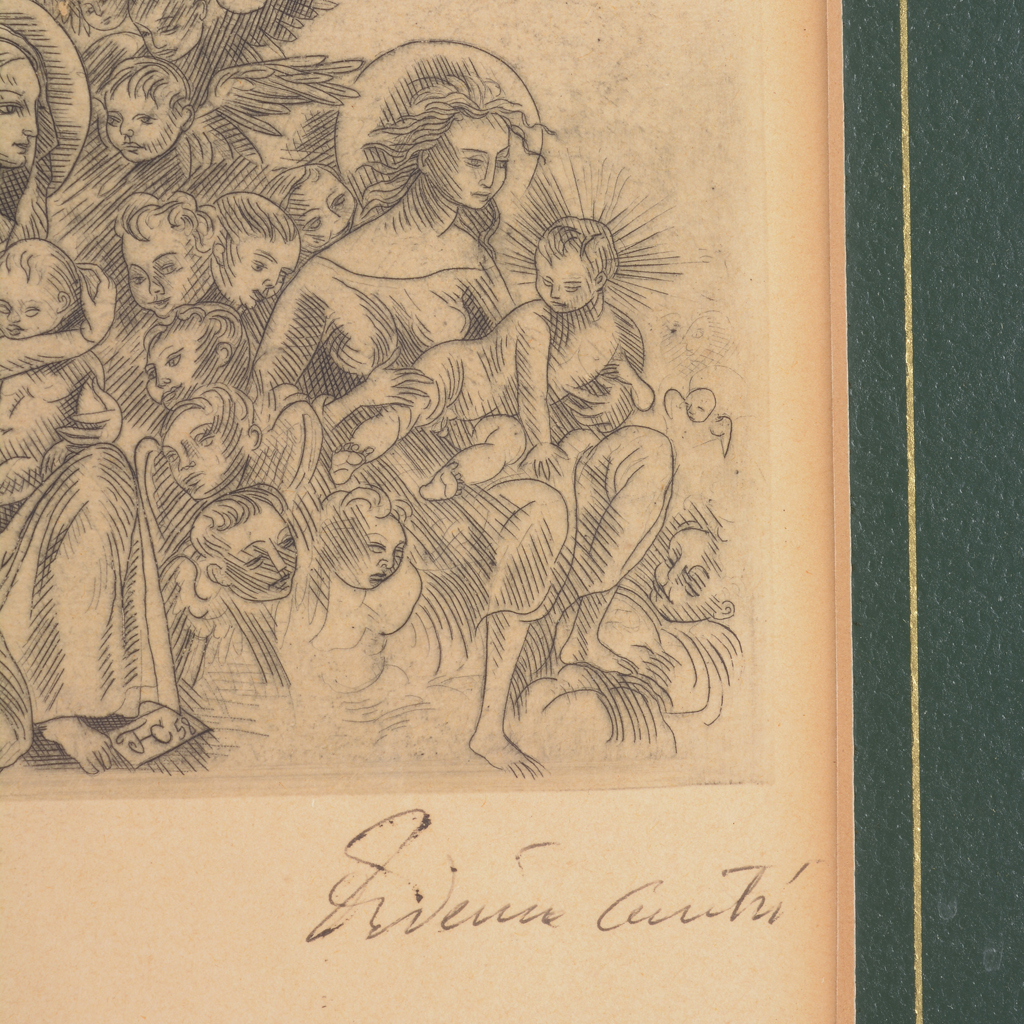 Federico Cantú (Cadereyta, Nuevo León, 1907 - Cd. México, 1989). Obras gráficas. Consta de: a) Rostros de ángeles. Grabado, serie 100/84. Firmado. Dimensiones: 6.5 x 11 cm. b) Virgen María con Santa Isabel. Grabado, serie 208/60. Firmado. Dimensiones: 9 x 10 cm. Enmarcados. Piezas: 2 Estimado $ 4,500-5,500
