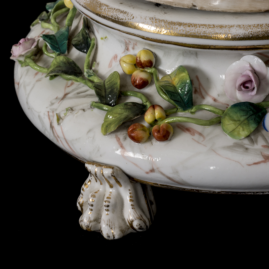 Figuras decorativas. Alemania. Principios del siglo XIX. Elaboradas en porcelana policromada. Bases circulares con bases a manera de pata de garra. Consta de: alegoría del verano y alegoría del otoño. Presentan detalles de conservación, de estructura, fisuras, faltantes y restauraciones. Dimensiones: 57 cm. Piezas: 2 Estimado $ 4,500-7,000