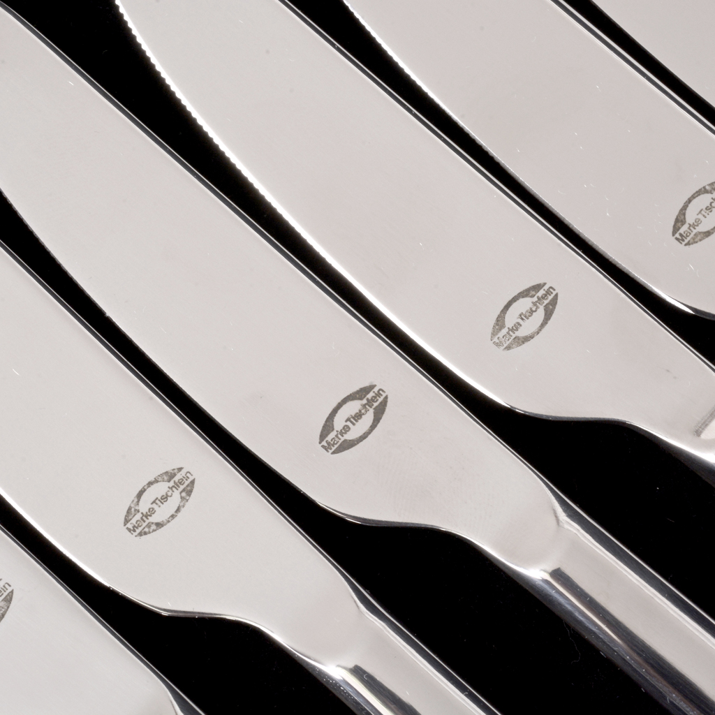 Juego de cubiertos. Alemania. Siglo XX. Marca Tischfein. Elaborados en metal plateado. Servicio para 12 personas. Consta de: 12 cucharas para sopa, 12 cucharas para café, 12 tenedores para carne, 12 tenedores para postre, 12 cuchillos para carne y 10 cubiertos de servicio. Con estuche (presenta humedad y desgaste). Piezas: 70 Estimado $ 4,000-6,000