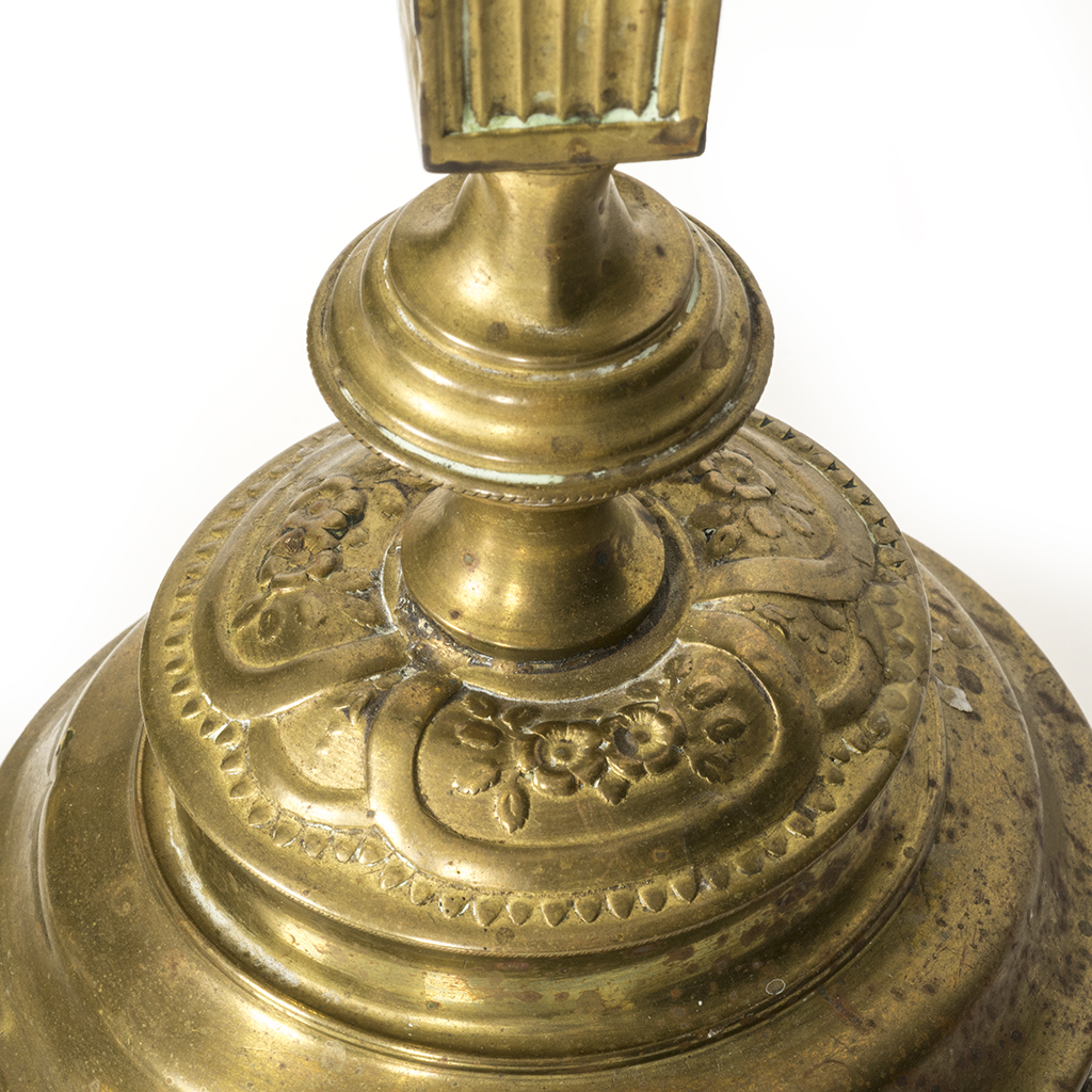 Artículos decorativos. Siglo XX. Elaborados en bronce y metal dorado. Diferentes diseños y tamaños. Consta de: 2 pares de candeleros y crucifijo para empotrar. Presentan detalles de conservación, de estructura, abolladuras, manchas, marcas y desgaste. Dimensiones: 36 cm. (mayor). Piezas: 5 Estimado $ 3,000-5,000