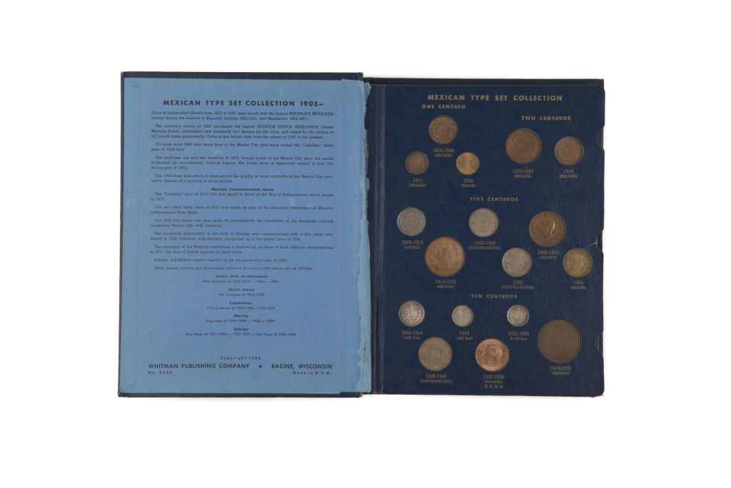 AO - Mexican Type Set Collection 1905 - 1960. Racine, Wisconsin: Whitman Publishing Company, 1963. 4o., 49 monedas, diferentes tamaños. Uno, dos, cinco, diez, veinte, veinticinco, cincuenta centavos y uno, dos, cinco y diez pesos, en bronce, níquel, latón y diferentes aleaciones. Con las efigies de Josefa Ortiz de Domínguez, Benito Juárez, Cuauhtémoc, José María Morelos y Pavón, Miguel Hidalgo y Costilla y Venustiano Carranza. Con algunas monedas conmemorativas, El peso "Caballito", Centenario de la Independencia, La inauguración del Ferrocarril México - Veracruz y el Centenario de la Constitución de 1957. Años 1905 - 1960. En álbum. Estimado $ 18,000-20,000