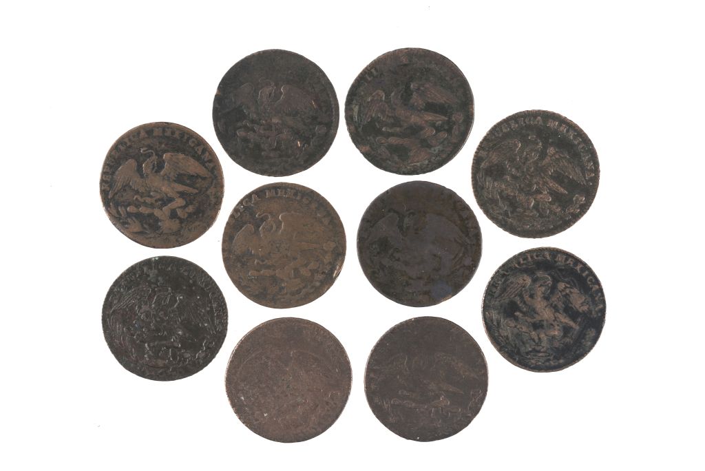 AG - República Mexicana. Cuartillas. México, 1835 y 1836. Cobre, 26 mm. Anverso: Escudo Nacional con leyenda: "República Mexicana"; sobre ramas de roble y olivo. Reverso: " 1/4 - Mo. - (1835 y 1836)", rodeada por una corona de palma. Piezas: 10. El 28 de marzo de 1829 se autorizó la acuñación de monedas de cobre con denominaciones de un cuarto de real, entre otras denominaciones, con un tamaño y peso exagerados para ser de este metal. El 23 de agosto de 1829 se publicó un nuevo decreto que ordenaba la reducción del peso y diámetro de estas monedas, sin embargo, las monedas de cobre no fueron bien recibidas, eran recibidas por "peso" y no por su valor facial, algunos artículos tenían marcado un precio si se pagaba con plata y otro, muy inferior, si se hacía con cobre, Había ventajosas "casas de cambio" particulares, que canjeaban el cobre por plata al 50 por ciento de su valor. A través de repetidos decretos se trató de anular la acuñación en cobre, pero por necesidades del erario se siguió haciendo. Véase en: "Historia Numismática de México de 1823 a 1950". Sociedad Numismática de México, 1957. Estimado $ 3,000-4,000