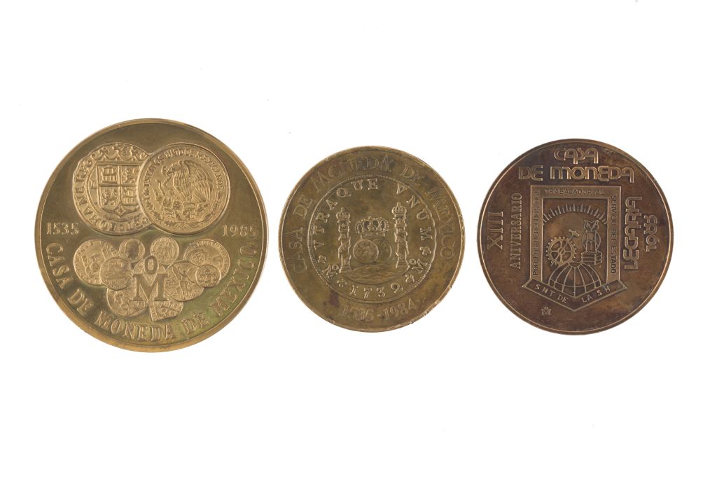 Bronce, 50 mm. Anverso: Reproducción de la moneda "Carlos y Juana" con incrustación de "1 peso de Morelos" de 1980.Reverso: Al centro, reproducción de dos monedas entrelazadas; debajo, algunos ejemplares numismáticos incrustados, y en primer plano, la ceca. Con leyenda "1535 - 1985 Casa de Moneda de México".