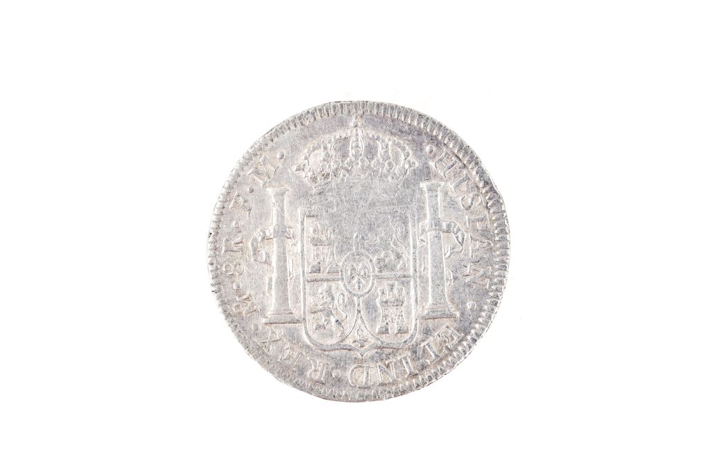 AC - Arance y Cobos, Francisco - Rodríguez, Mariano. Con leyenda: Carlos IV, Ocho Reales. México, 1795. Plata, 40 mm. Anverso:Efigie de Carlos IV de perfil a la derecha, con leyenda: "Carolus IIII - Dei - Gratia - 1795". Reverso: Escudo español coronado entre columnas de Hércules coronadas con inscripción en bandas "Plus - Vltra", con leyenda "Mo. - 8 R. - F. M. - Hispan. - Et - Ind - Rex". Canto grabado. Estimado $ 4,000-5,000