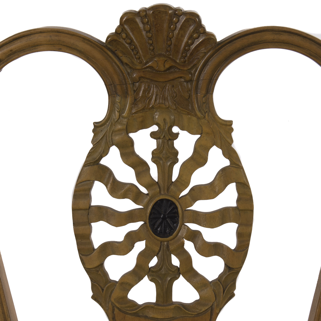 Con respaldo abierto, asientos en tapicería cuadriculada en color amarillo con verde y soportes tipo cabriolé.