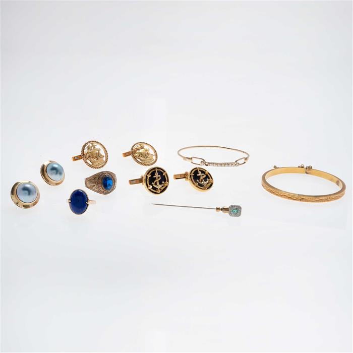 Dos pulseras, 2 pares de mancuernillas, 3 pares de aretes, 2 anillos, 1 fistol, 3 pendientes. 1 medalla, prendedor con sombrero y 1 collar de perlas con lapislázuli, corales, medias perlas y esmeralda en oro amarillo de 8k- 10k- 14k- y 18k. Talla: 6 y 11. Peso: 129.4 g. Estimado $50,000-70,000