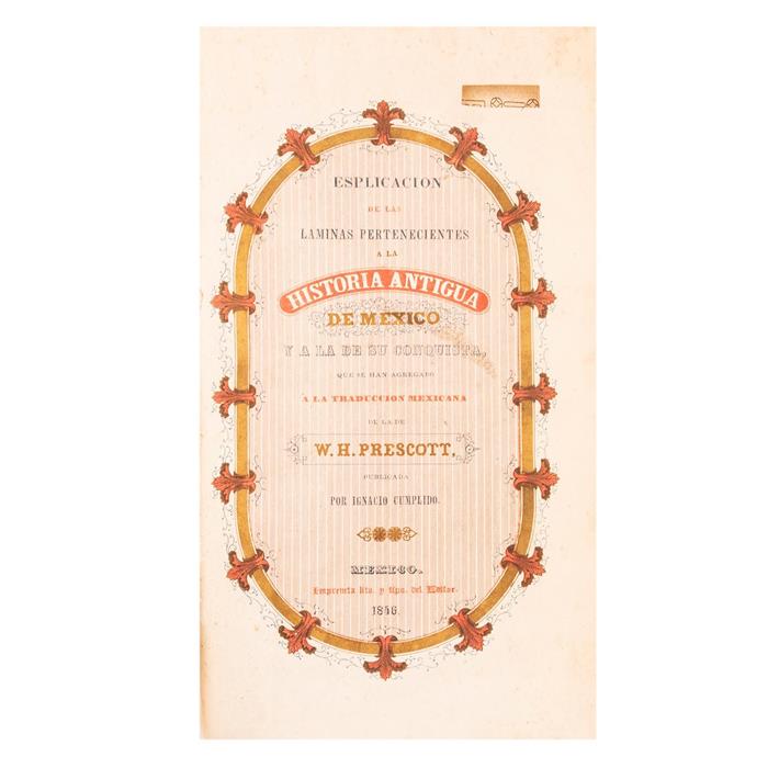 PRESCOTT, WILLIAM H. HISTORIA DE LA CONQUISTA DE MÉXICO, CON UNA OJEADA PRELIMINAR SOBRE LA ANTIGUA CIVILIZACIÓN DE LOS MEXICANOS, Y CON LA VIDA DE SU CONQUISTADOR FERNANDO CORTÉS. MÉXICO: IGNACIO CUMPLIDO, 1844 - 1846. 8o. marquilla, VIII + 563 p. + 2 h.; 489 + XX + 124 p. + 2 h.; IV + 154 p. Traducida al español por Joaquín Navarro. Tomos I - III, con frontispicio en color: Cromolitografía de I. Cumplido. Tomo I: Falta página 181-182. Tomo II: Dos láminas. Tomo III: Esplicación de las láminas pertenecientes a la Historia Antigua de México y a la de su Conquista, que se han agregado a la Traducción Mexicana. Un mapa "Mapa del Valle de México" a doble página, cuatro láminas plegadas, una lámina en color y 63 láminas. Lomos deteriorados. Encuadernados en pasta dura, en piel. Piezas: 3. Palau: 236493. "Es la edición más apreciada" Porrúa 1949: 9704. Sabin: 65267 y 65268. Estimado $7,000-12,000