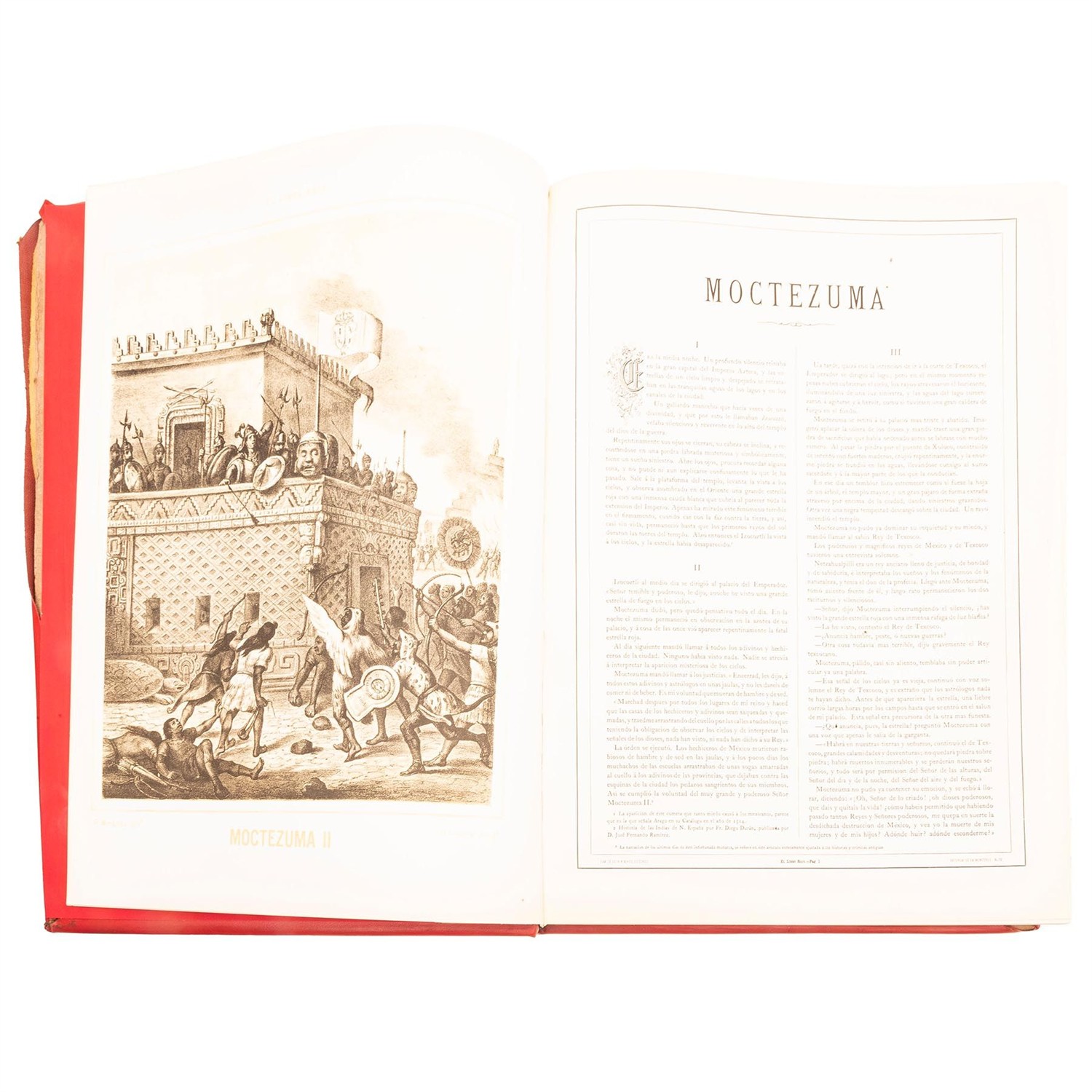 RIVA PALACIO, VICENTE / PAYNO, MANUEL. EL LIBRO ROJO 1520 - 1867. MÉXICO: EDITORIAL DEL VALLE DE MÉXICO, 1972. fo. marquilla, 153 p. Facsimilar. Ilustrado con láminas de página. Pasta anterior deteriorada. Encuadernado en pasta dura. Asombrosa edición de litografías que representan a los mártires de la nación mexicana, tanto religiosos como políticos. El título Libro Rojo, significa el derramamiento de sangre a través de la historia de México. Representados aquí están Moctezuma II, Cuauhtemoc, Martín Cortéz, Pedro de Alvarado, la familia Carbajal, la familia Dongo, Hidalgo, Allende, Morelos, Guerrero, Los Mártires de Tacubaya y Maximiliano. Las litografías son tomadas de dibujos por Primitivo Miranda, litografiados por Hernández e Iriarte, impresos por Díaz de León y White. Riva Palacio y Payno procuraron inmortalizar aquellos que habían sacrificado sus vidas a favor de la nación mexicana. Estimado $800-1,500