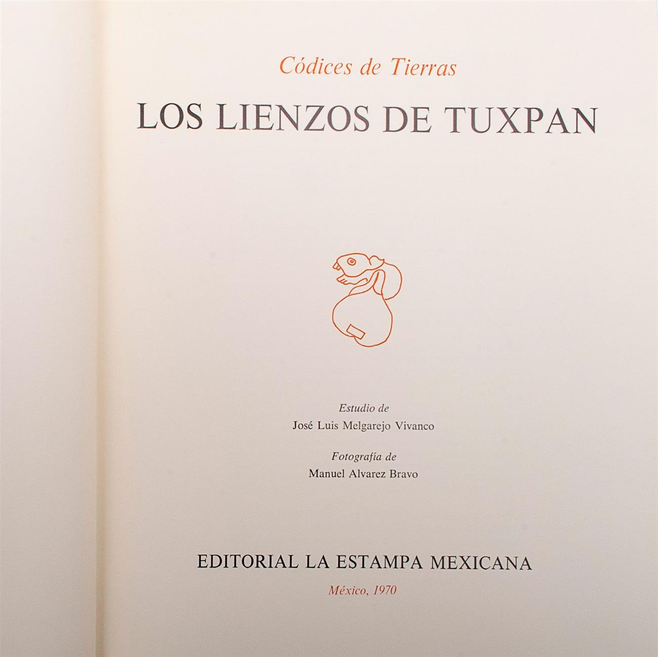 MELGAREJO VIVANCO, JOSÉ LUIS. CÓDICES DE TIERRAS. LOS LIENZOS DE TUXPAN. MÉXICO: PETRÓLEOS MEXICANOS, 1970. 4o. marquilla, 217 p. Fotografía de Manuel Álvarez Bravo. Encuadernado en pasta dura, en tela, con estuche. Estimado $1,300-3,000