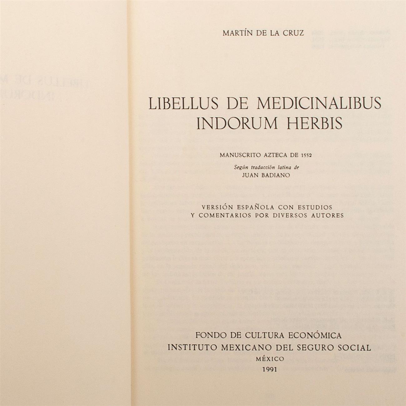 CÓDICES: LIBELLUS DE MEDICINALIBUS – NUTTALL – MENDOZA. a) Cruz, Martín de la. Libellus Medicinalibus Indorun Herbis. México: Fondo de Cultura Económica / Instituto Mexicano del Seguro Social, 1991. 8o. marquilla, 258 p.; Facsímil. Manuscrito Azteca de 1552, según traducción de Juan Abadiano. Encuadernados en rústica. Piezas: 2. b) The Codex Nuttall. A Picture Manuscript from Ancient Mexico. New York: Dover Publications, Inc., 1975. 8o. marquilla apaisado, XXII p. The Peabody Museum facsimile edited by Zelia Nuttall. Encuadernado en rústica. c) Colección de Mendoza o Códice Mendocino. Documento Mexicano del Siglo XVI que se conserva en la Biblioteca Bodleiana de Oxford, Inglaterra. México: Editorial Innovación, 1980. 4o. marquilla, LIV + Códice. Facsímile Fototípico dispuesto por Don Francisco del Paso y Troncoso. Edición acompañada de una introducción; de la copia literal y escrupulosamente cotejada del texto explicativo; de anotaciones y comentarios por Jesús Galindo y Villa. Contribución al Primer Centenario de la Fundación del Museo Nacional. Facsímil de la edición de 1925. Encuadernado en rústica. Total de piezas: 4. Estimado $1,300-3,000