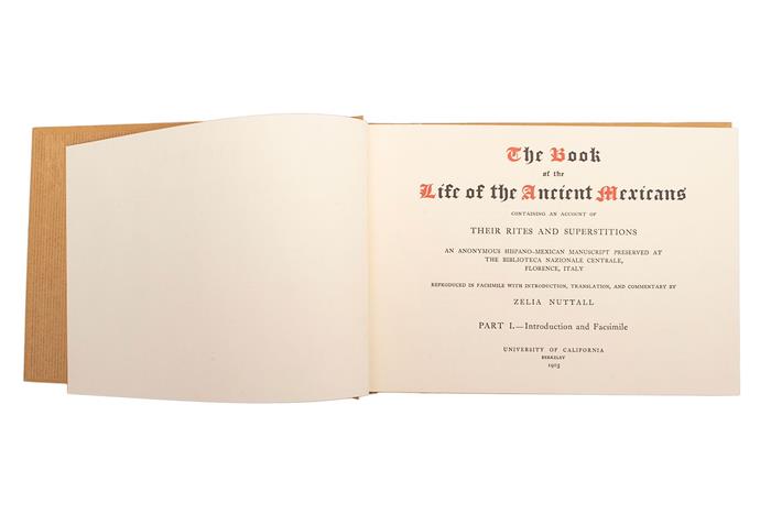 NUTTALL, ZELIA / BONNE, ELIZABETH HILL. THE BOOK OF THE LIFE OF THE ANCIENT MEXICANS / THE CODEX MAGLIABECHIANO. BERKELEY: UNIVERSITY OF CALIFORNIA: 1983. PIEZAS: 2. 8o. marquilla apaisado, XIX + facsímil / XIV + 250 p. Encuadernados en pasta dura, en estuche. Piezas: 2. Estimado $3,000-4,000