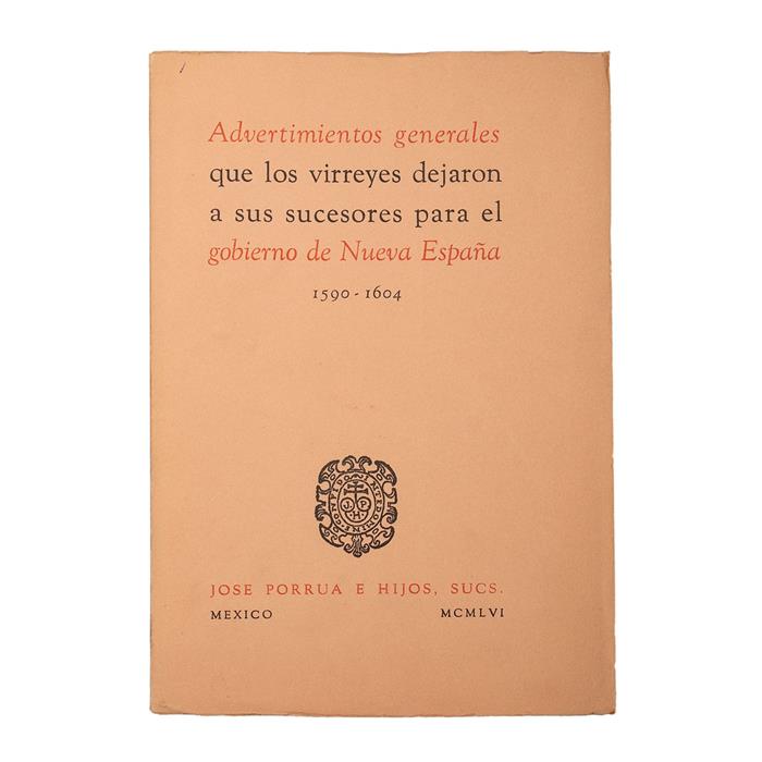 4o. marquilla. Edición de 100 ejemplares numerados. Títulos: Relación de las Encomiendas de Indios Hechas en Nueva España a los Conquistadores y Pobladores de Ella, Año de 1504; Advertimientos Generales que los Virreyes Dejaron a sus Sucesores para el Gobierno de Nueva España; Ordenanza del Hospital de San Lázaro de México, Año de 1582.