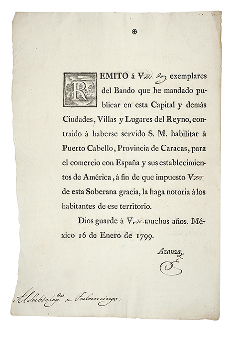 DI - Azanza, Miguel Joseph de. Bandos. a) "Cumplido ya desde el día 30 de Junio próximo anterior el término que se concedió en 10 de Enero último para la recolección de la Moneda circular antigua, era llegado por consiguiente el caso de reducir á efecto su absoluta extinción y giro; pero considerando que la poca que ha quedado de las clases menores, circula principalmente entre las manos de los Indios y demás gentes miserables; he tenido á bien ampliar el plazo de su colección por otros seis meses mas, que deberán contarse desde el principio del presente fin de Diciembre de este año, quedando en su vigor y fuerza la prohibición de extraer para Lugares ultramarinos por cuenta de S. M. y de Particulares la indicada Moneda antigua de oro y plata, permitiéndose solo la salida y embarque de la del corriente sello con destino á España en todas las suertes de la primera; doble y tostones de la segunda; y para las Islas Filipinas y de Barlovento en todas las especies de ambos metales, baxo la inteligencia de que concluido dicho término ha de cesar su curso en el Comercio, sin admitirse, ni darle mas valor que el de pura pasta, como con repeticion se halla prevenido". México á 12 de Julio de 1798. Miguel Joseph de Azanza. Rubrica. Pequeña rotura a la mitad del documento. b) "Remito á Vm. dos exemplares del Bando que ha mandado publicar en esta Capital y demás Ciudades, Villas y Lugares del Reyno, contraído á haberse servido S. M. habilitar á Puerto Cabello, Provincia de Caracas, para el comercio con España y sus establecimientos de Ameérica, á fi de que impuesto Vm. de esta Soberana gracia, la haga notoria á los habitantes de ese territorio". México 16 de Enero de 1799. Azanza. Rubrica. Total de piezas: 2. Estimado $4,000-5,000