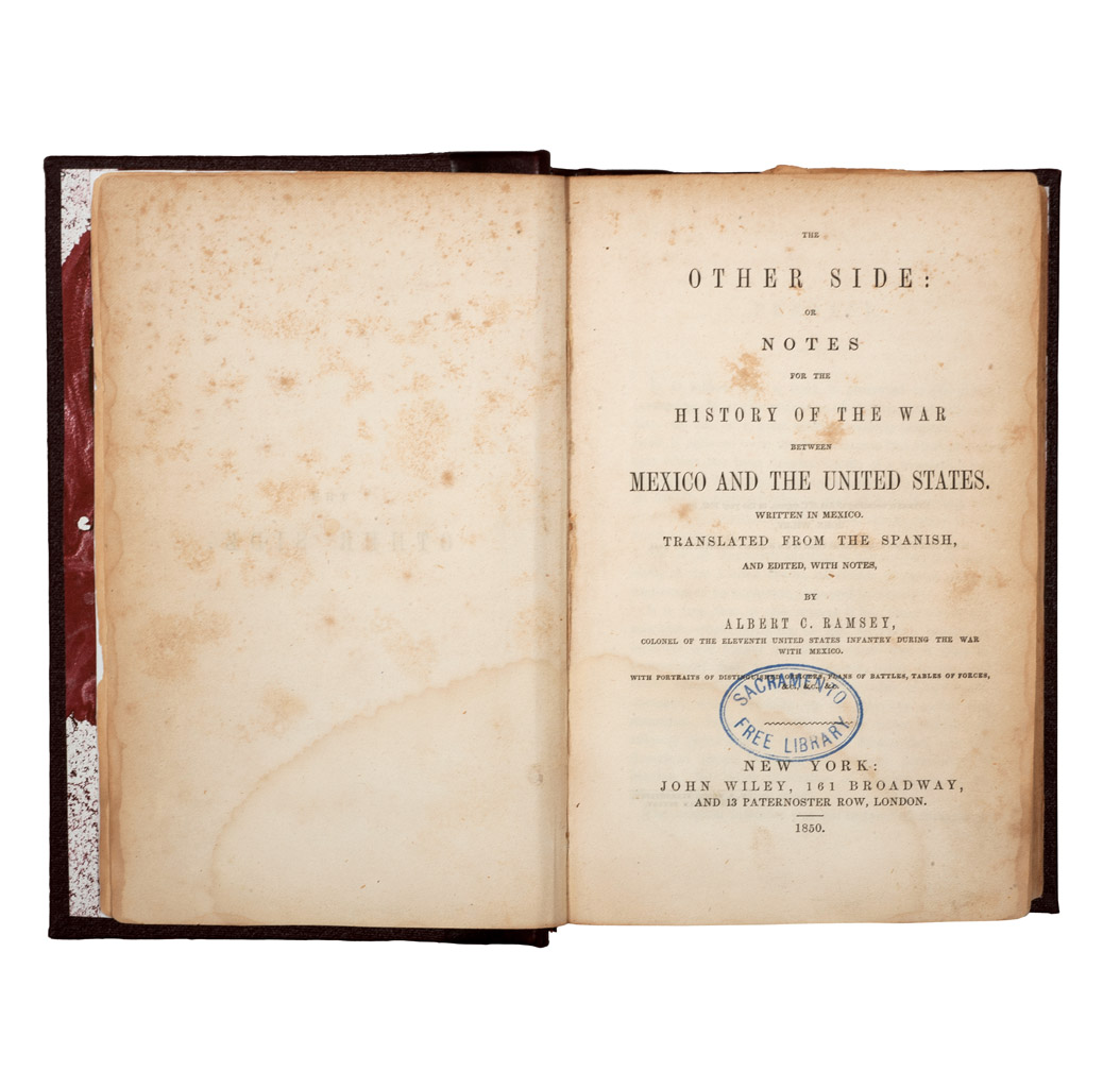 HM - Ramsey, Albert C. The Other Side or Notes for the History of the War between Mexico and the United States. New York: John Wiley, 1850. 8o. marquilla, XV, 458 p. Written in Mexico. Translated from the spanish, and edited, with notes by Albert C. Ramsey. Con 9 retratos litográficos y 14 planos plegados. Portada con sello "Sacramento Free Library". Un plano parcialmente restaurado y otro con manchas. Con manchas de óxido y humedad, sin afectar el texto. Encuadernado en pasta dura, lomo en piel. Estimado $8,000-10,000