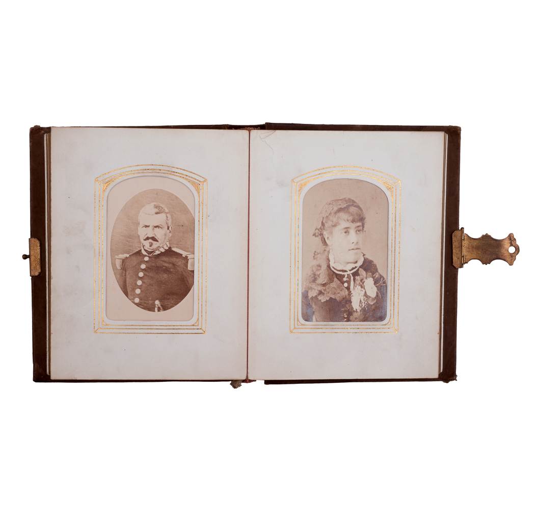 Tarjetero. Tarjetas de Visita. México, Siglo XIX. Fotografías, retratos de damas, caballeros y niños. Fotógrafos: Salvatierra, J. Lacroix, Cornelis, José Monterrubio, Médaille D'or, Eduart & Cobb, Cruces y Campa, Valleto y, Coyne y Marin. 15 hojas con dos retratos cada una y 1 hoja con un retrato. Lomo y pastas gastados. 12 hojas rasgadas. Encuadernado en pasta dura, con broche de bronce. Estimado $6,000-8,000