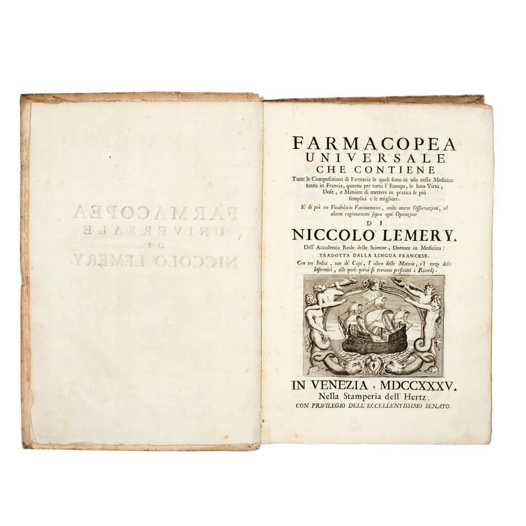 Ejemplar compuesto por 4 partes: Farmacopea Universale; Molte preparazioni minori de Farmacia; Delle preparazioni e composizioni interne; Farmacopea universale, che contiene le Composizioni che fi applicano all´ efterno.