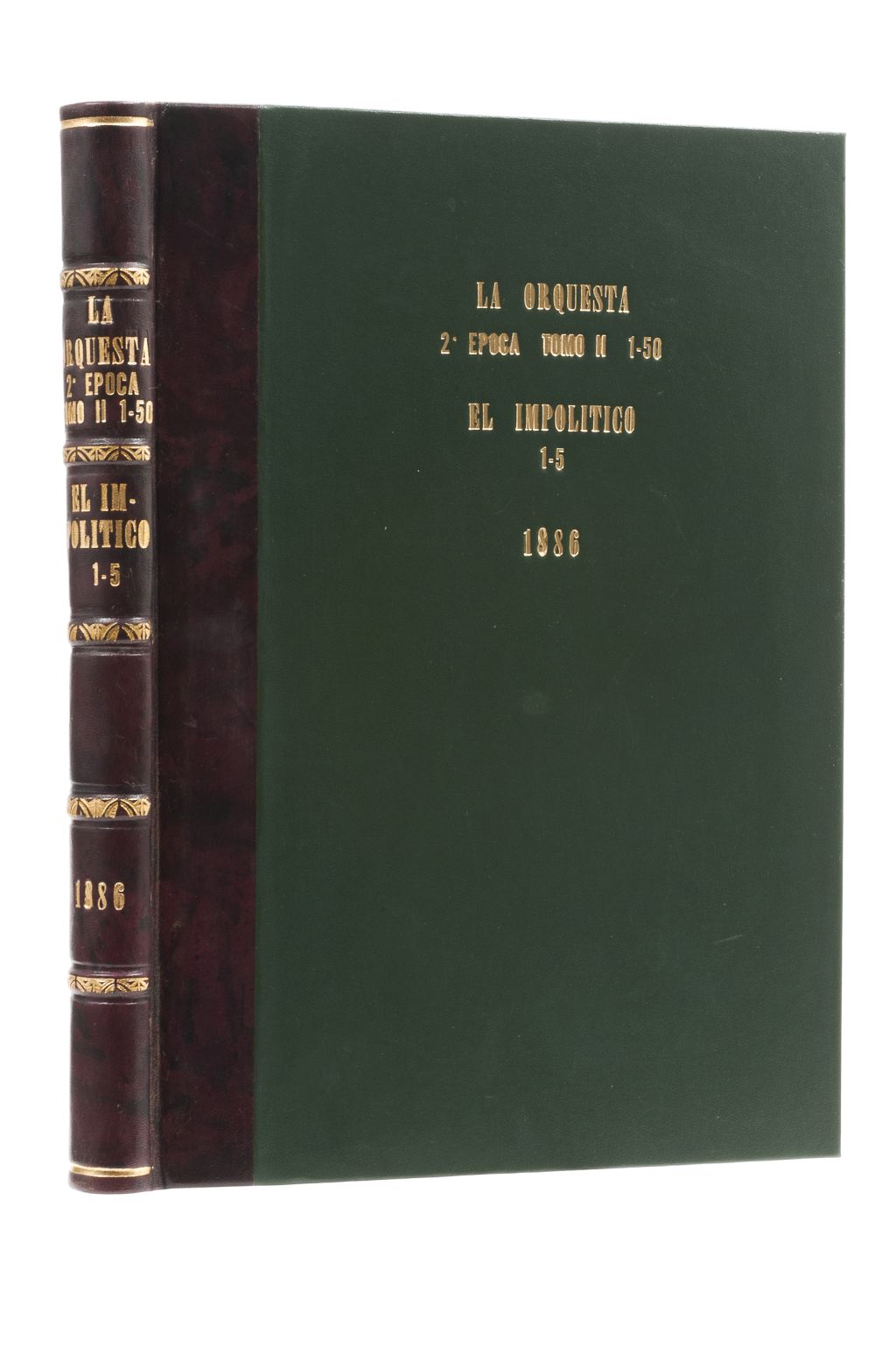 P - Villegas, Manuel C. - Iriarte, H. - Escalante, C. / Casasola, José María. La Orquesta / El Impolítico. a) C. Villegas, Manuel. - Iriarte, H. - Escalante, C. (editores). La Orquesta. Periódico Omniscio, de Buen Humor y con Caricaturas. México: Imprenta Literaria, 1866. fo. Segunda época. Tomo II - Números 1 al 50 (Enero - Julio de 1866). Cada número de 4 páginas, texto en 3 columnas, con una litografía en cada número de Constantino Escalante. b) Casasola, José María (responsable). El Impolítico. Periódico de todas las cosas impolíticas con estampas. México: Imprenta Literaria, 1866. fo. Tomo I - Número 1 al 5 (6 de Junio - 23 de Junio de 1866). Cada número con 4 páginas, texto a 3 columnas, con una litografía de Constantino Escalante. Dos Obras en un volumen. Encuadernado en pasta dura, lomo en piel. En marzo de 1861, el periódico La Orquesta fue fundado por Carlos R. Casarín -quien utilizaba el seudónimo de "el ciudadano Roberto Macario"- y Constantino Escalante, fue editado por Manuel C. de Villegas. Los tres, junto con el grabador Hesquicio Iriarte, fueron los propietarios. La publicación salía a la venta cada miércoles y sábado. Su estilo fue satírico y mordaz. Como un signo distintivo y pionero, en el periódico se utilizó la caricatura política. Esta alternativa de crítica política fue seguida más tarde por "El Ahuizote". El formato de la publicación era de cuatro hojas, una de folletín, otra de caricaturas y dos correspondientes a artículos y noticias. En diversas ocasiones sus redactores fueron hechos prisioneros o agredidos. La Orquesta fue siempre un periódico de oposición, no solamente criticó a los gobiernos conservadores, la intervención francesa y al imperio de Maximiliano, también lo hizo con los gobiernos de Benito Juárez, Sebastián Lerdo de Tejada y Porfirio Díaz. Una vez restaurado el sistema republicano en México, la línea editorial del periódico intentó reconciliar a conservadores y liberales. En 1866 suspendió su publicación, fue sustituido brevemente por "El Impolítico" bajo la dirección de José María Casasola, periódico que se editó solamente en cinco ocasiones. En junio de 1867 se reanudó la publicación de La Orquesta, esta vez bajo la dirección de Vicente Riva Palacio, quien utilizó el seudónimo de "Juan de Jarras", personaje de su propia novela Calvario y Tabor. Estimado $7,000-9,000