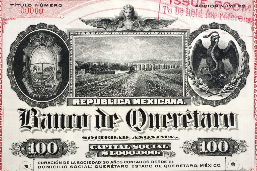 X - Acciones Bancos. a) Banco Peninsular Mexicano. 1 acción de $100.00 pesos. Mérida 31 de Marzo de 1908, conserva 41 de 50 cupones. b) Banco Mercantil de Veracruz. 1 acción de $100.00 pesos. Veracruz, Febrero de 1910, conserva 28 de 60 cupones. c) Banco de Querétaro. 1 acción de $100.00 pesos. Querétaro, Julio de 1907, conserva todos los cupones. Título No. 00000, por ser una muestra, marcada "SPECIMEN". Total de piezas: 3. Estimado $7,000-9,000